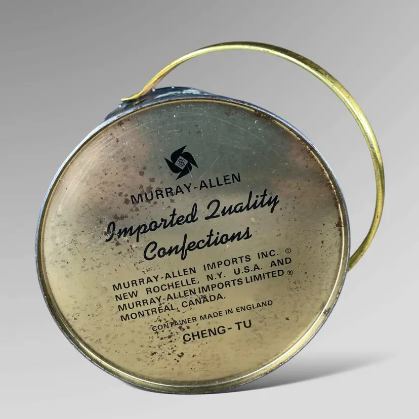 - This Murray Allen confection tin features a vibrant floral design with a white background, withblack, red, and gold accents
