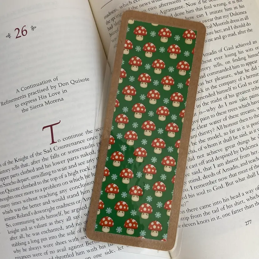 Mushroom snowflake design reinforced on brown cardstock. Single sided design. Laminated with 5MIL. No tassel.