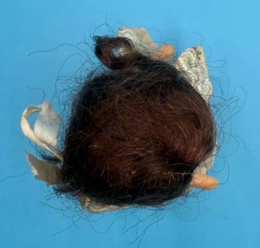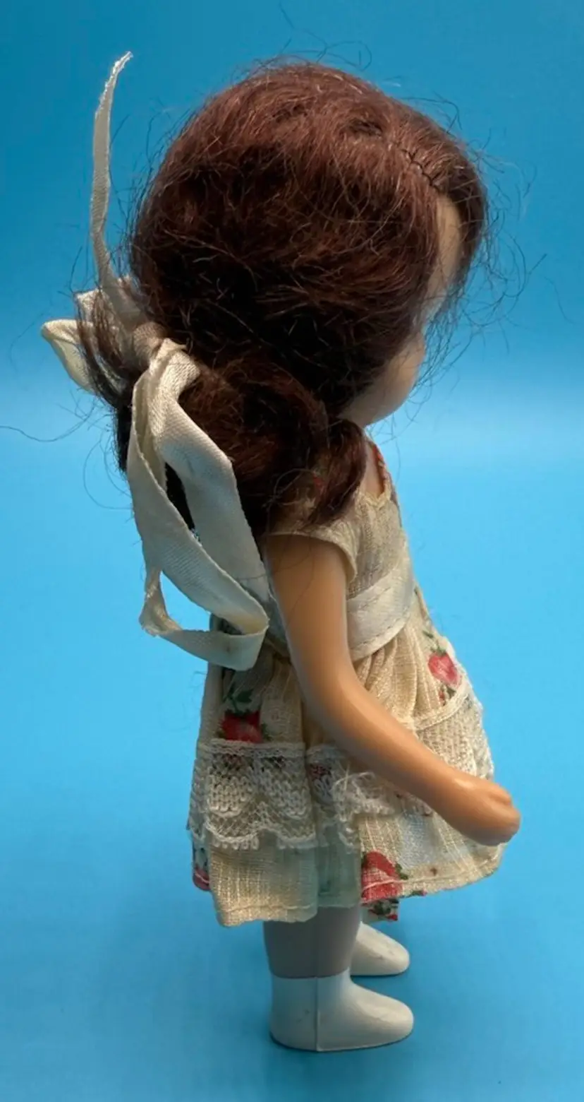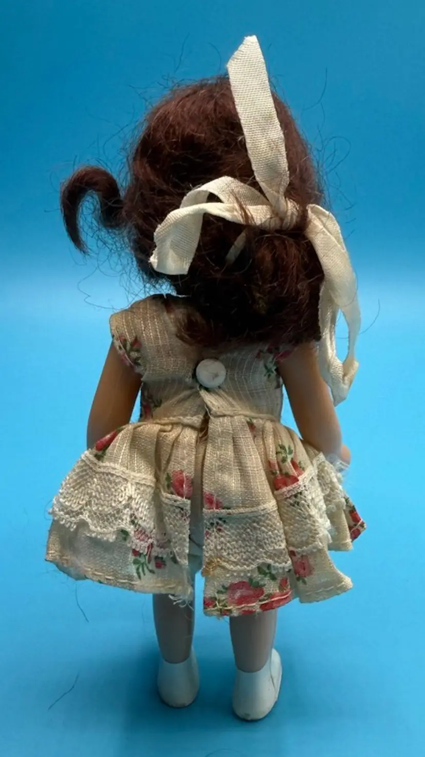 Condition: The eyes have detached and are loose in her head. There is wear to her wig, staining and wear to dress, satin bow and painted shoes. (see photos for details)