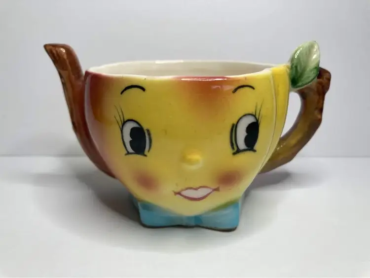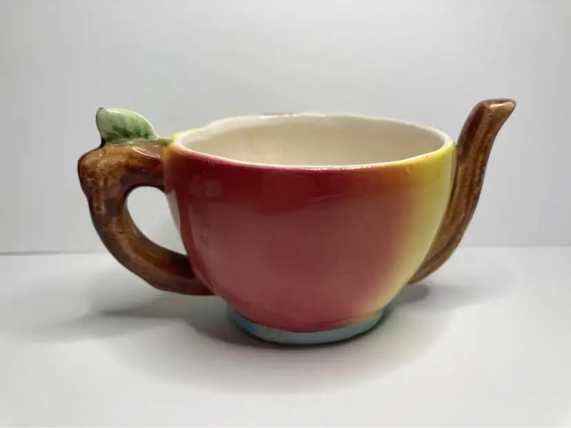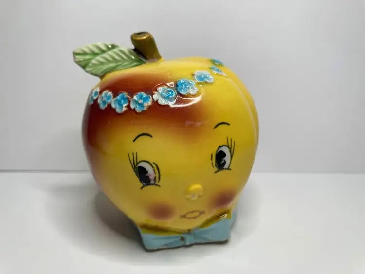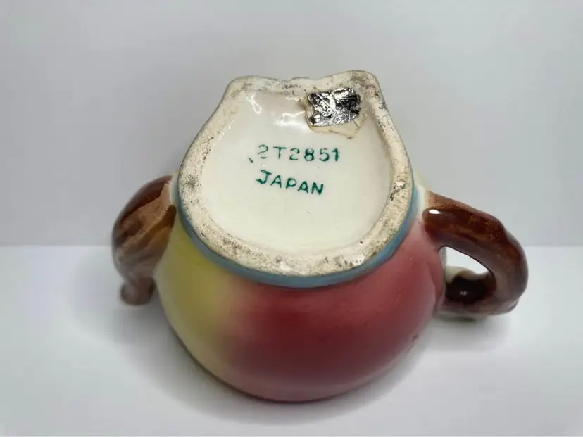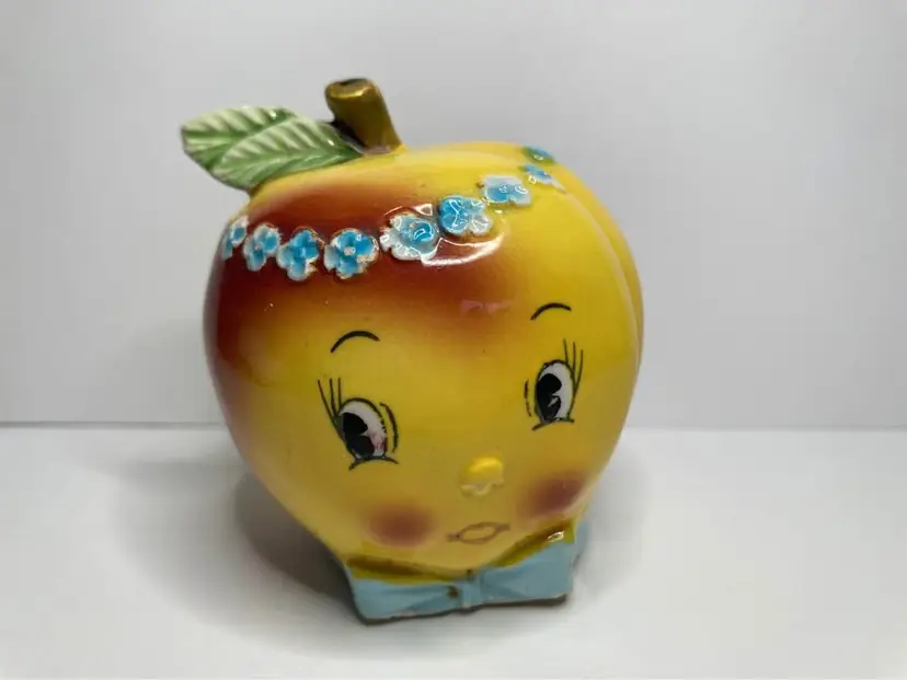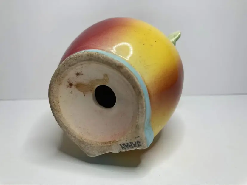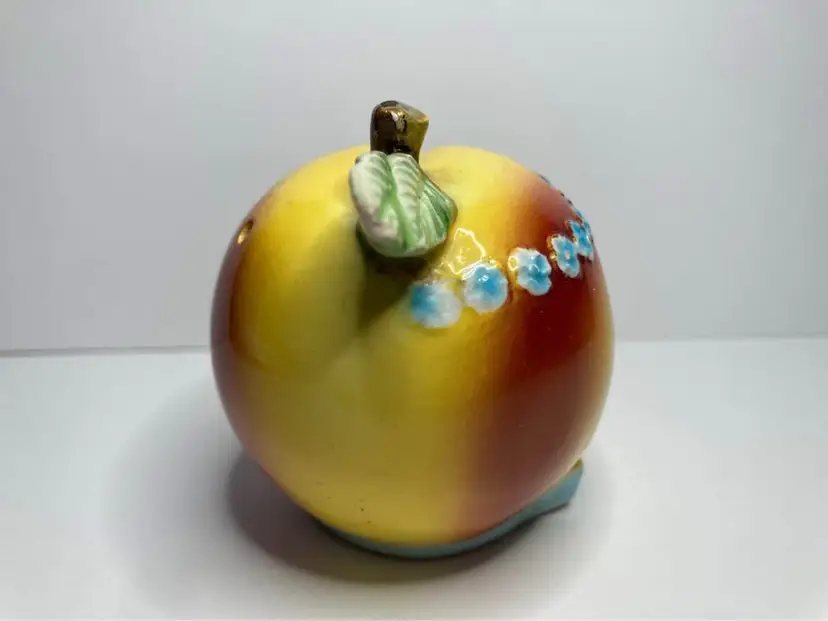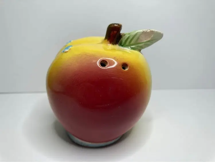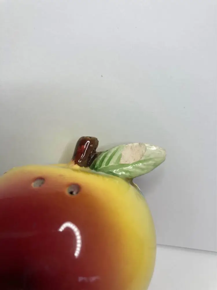 In good condition for age, some crazing, and one chip on back of leaf on shaker. Shaker has the wood cork stopper inside (could not remove). Condiment is missing the lid and minor production flaw with a bit of red dots on the eye of shaker. Displays really well still with those minor issues. See pictures for details. Approx size is 3x2”