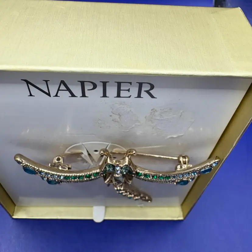 Napier Dragonfly Brooch Green, blue and clear rhinestones Measures2 1/4 inches long with wingspan of 3 inches