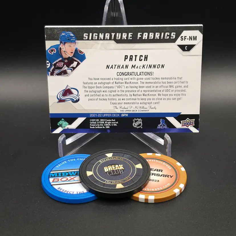 Nathan MacKinnon Patch Auto 2021-22 Upper Deck SPx Hockey Signature Fabrics Patch Insert Numbered 1/3 Card #SF-NM - Colorado Avalanche