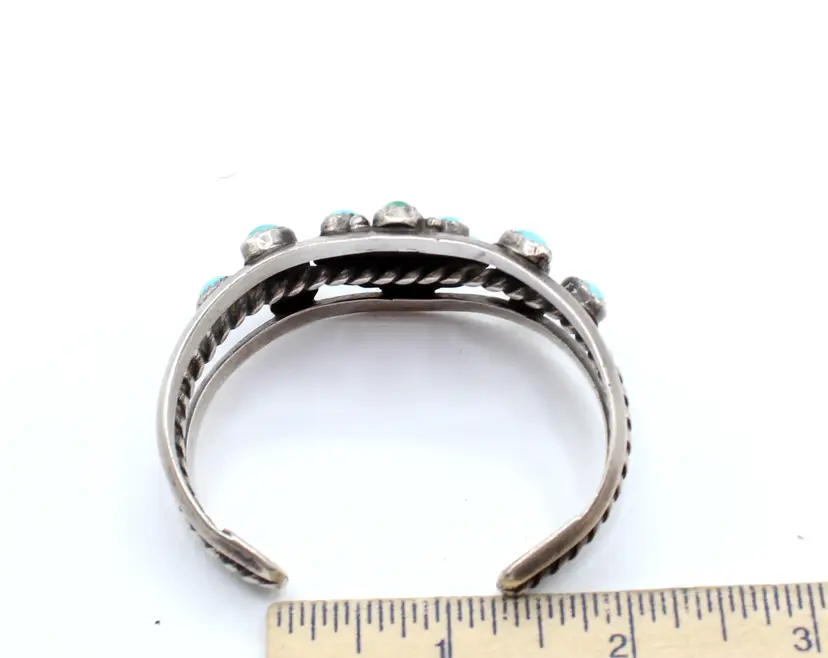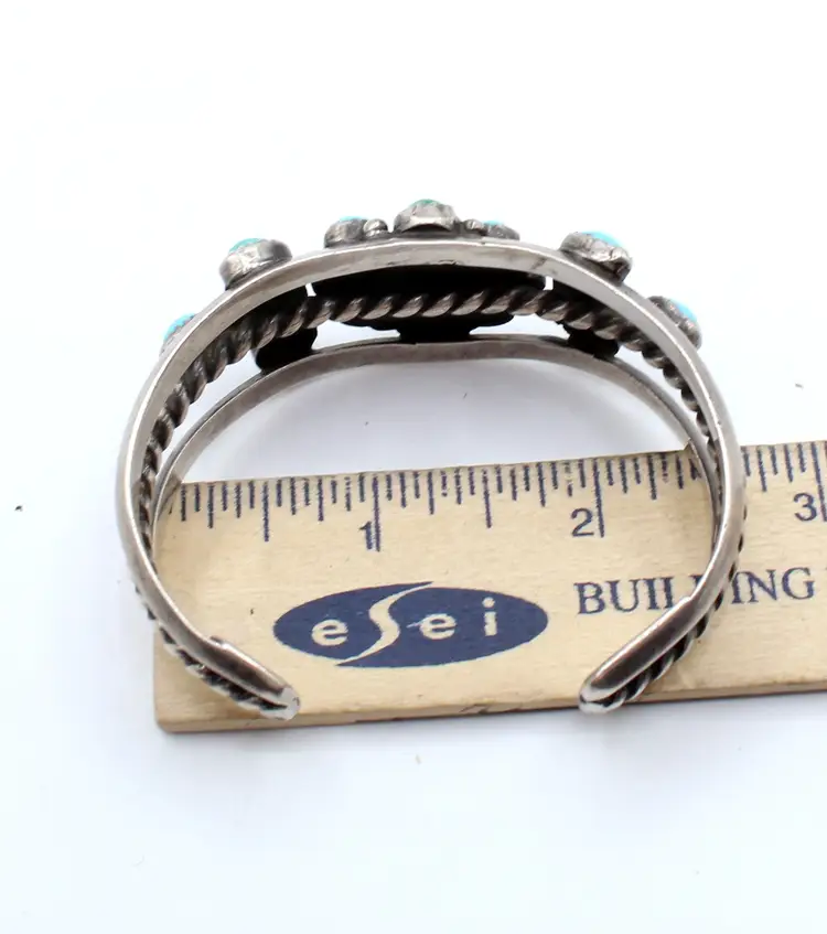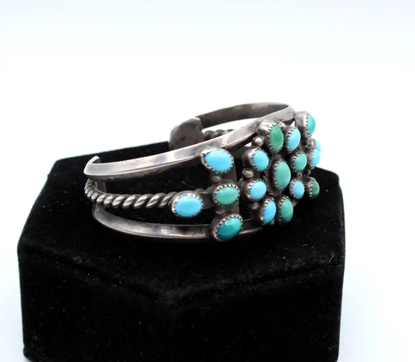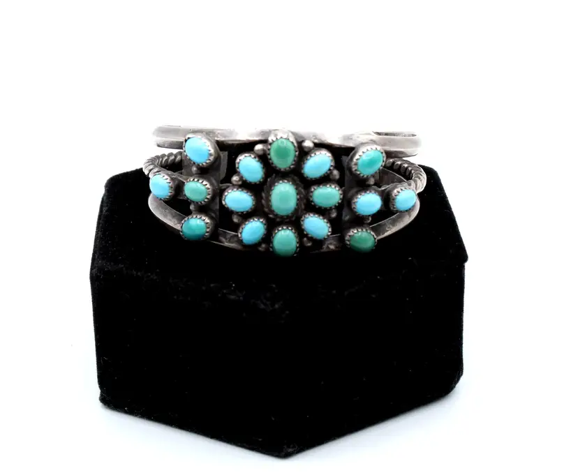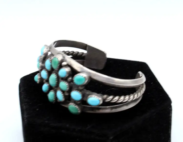 Stunning unsigned cluster flower bracelet. Beautiful blue turquoise turning green establishing some age. Seventeen stones set in saw-tooth bezels surrounded with drops. All set on a 3 open rail cuff with center rail a twisted wire heavy gauge. Inner diameter 5.5", gap 1.25", 1.25" wide