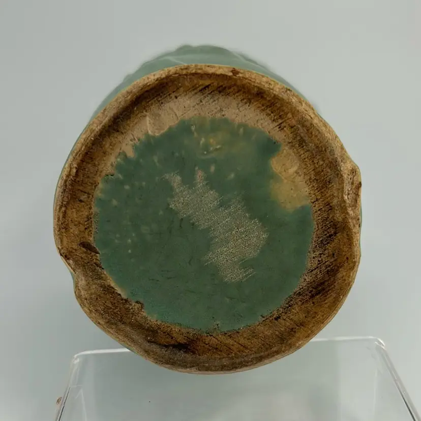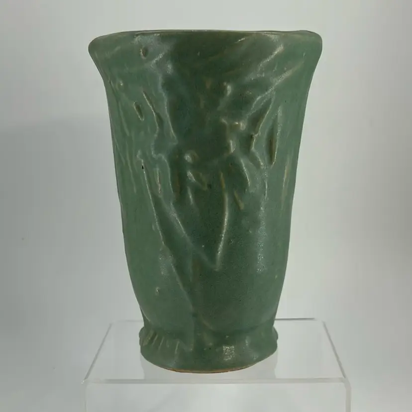 This pace is a Nelson McCoy pottery vase from the 1930s. It features a green glaze with a leaves and berries motive. It comes from the early depression era line of McCoy pottery. It can also be used as a planter. This piece stands 6 inches tall and 4 inches across the top. There are no chips or cracks.