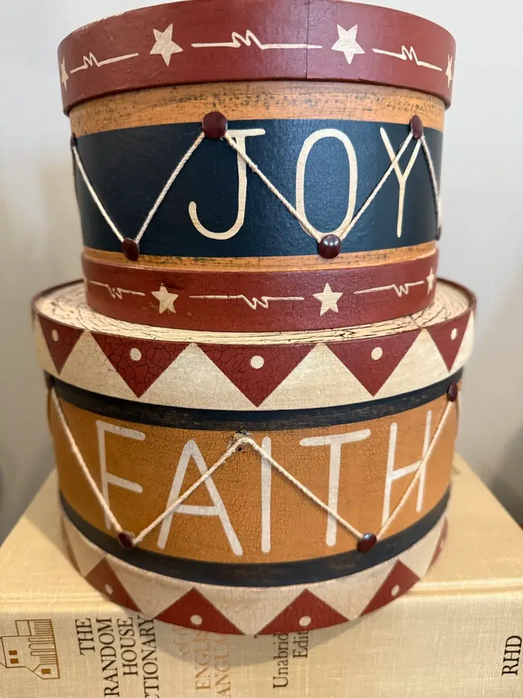 This set of nesting and stacking boxes features a primitive Christmas style. Each round box is designed for decorative storage, with a unique aged look. Perfect for adding a touch of rustic charm to any room.