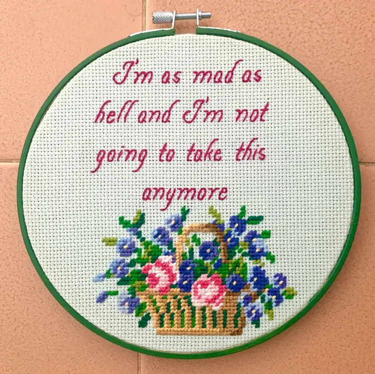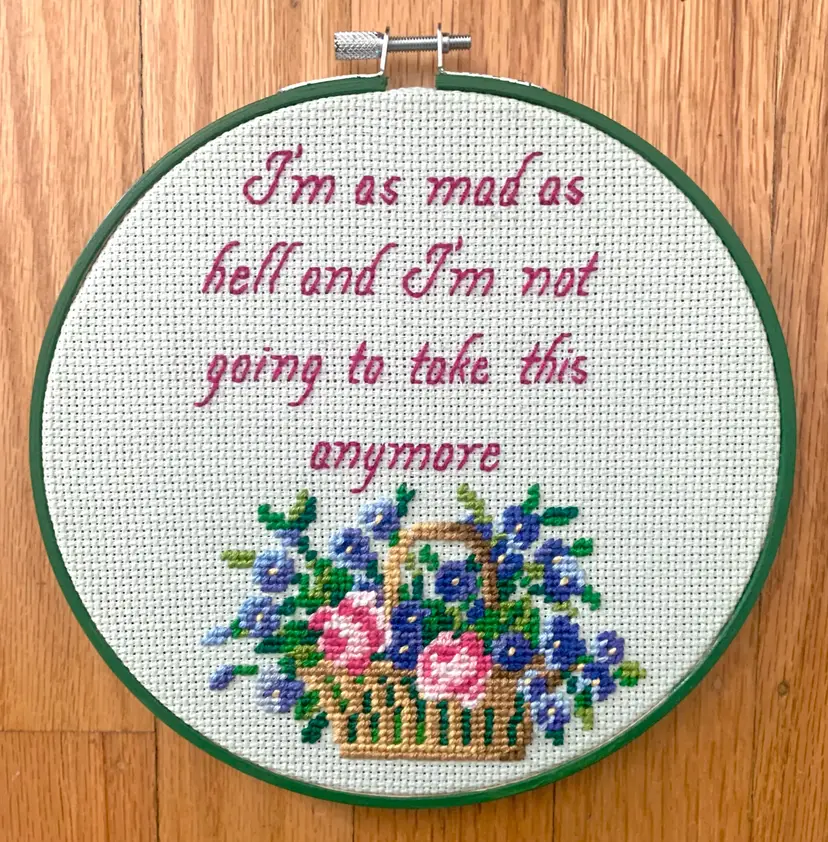 Stitched in pink is the famous and timely quote from the classic film, “Network” - “I’m as mad as hell and I’m not going to take this anymore” Go to your windows and shout it out!