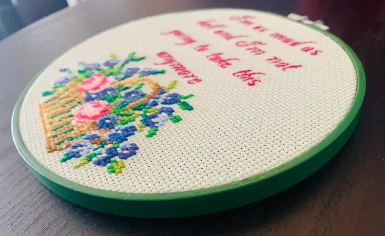 This piece is 7” across and features light green aida fabric and a green hoop.