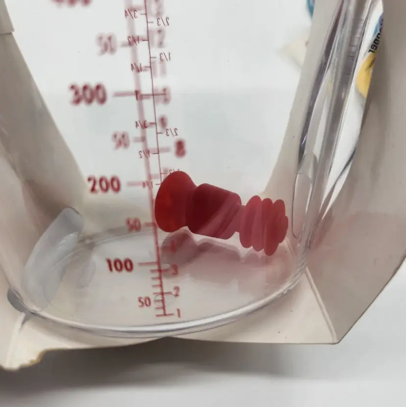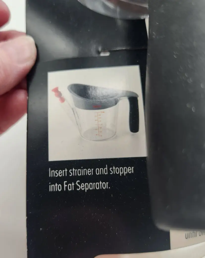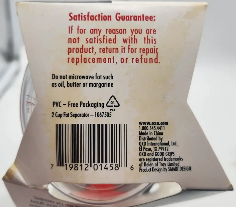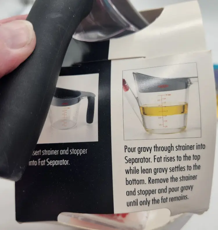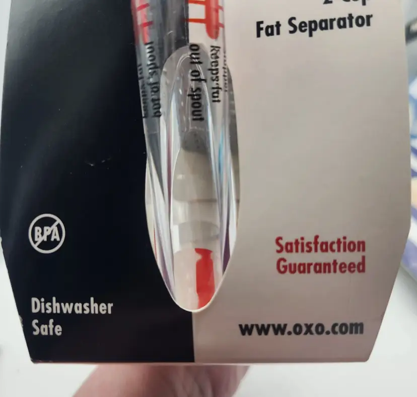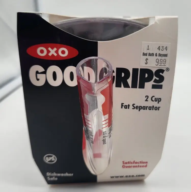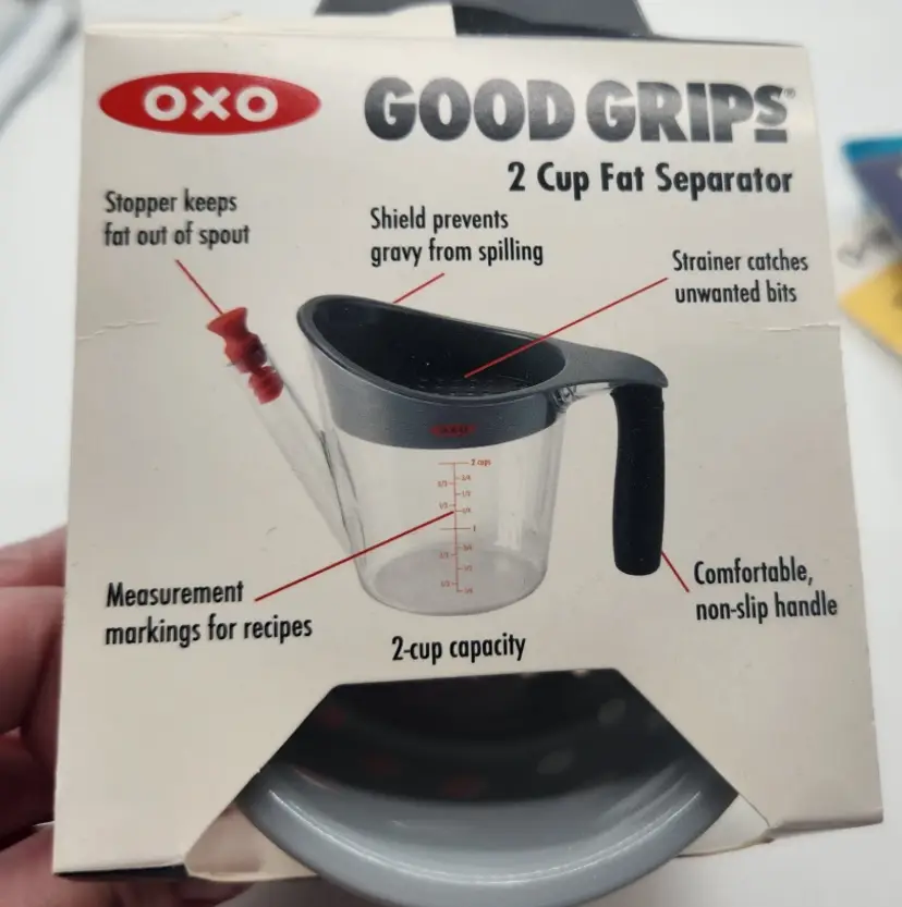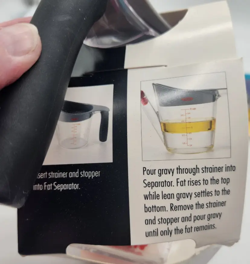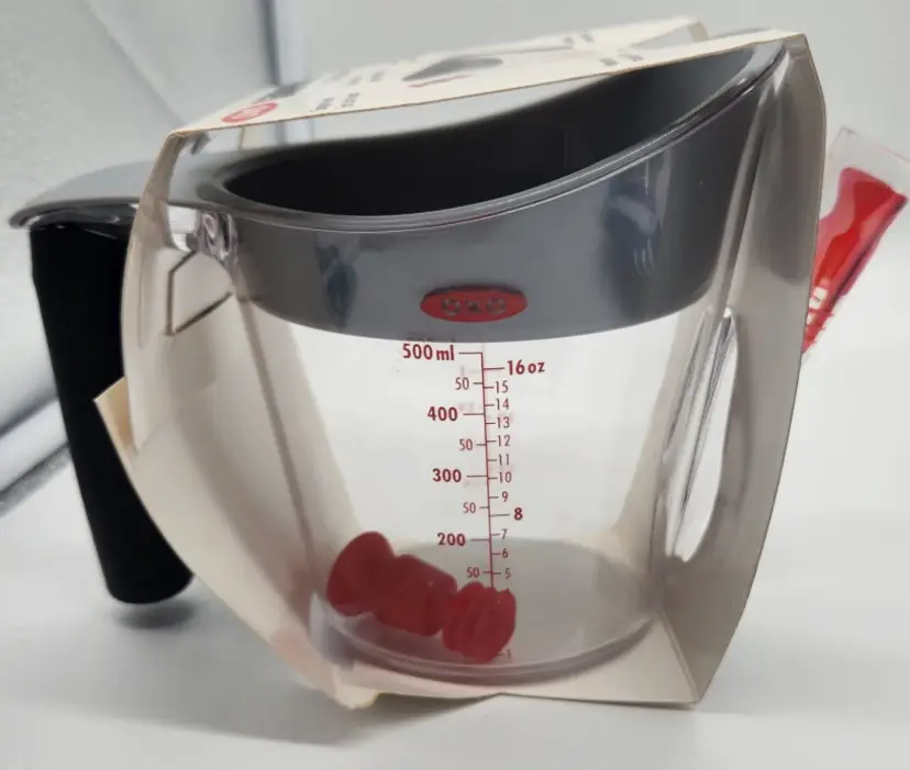 New in package 2 cup liquid measures cup with fat separator sprout, spill shield with a strainer to catch bits from falling into the cup. Soft grip handle and a silicone stopper to keep the fat out of the sprout. Red measurements on both sides, cups, ounces, and ml. There are no damages or flaws, brought to use, but never opened it up.