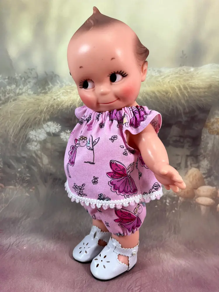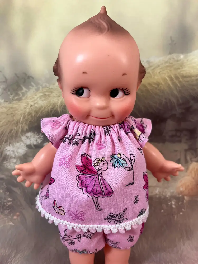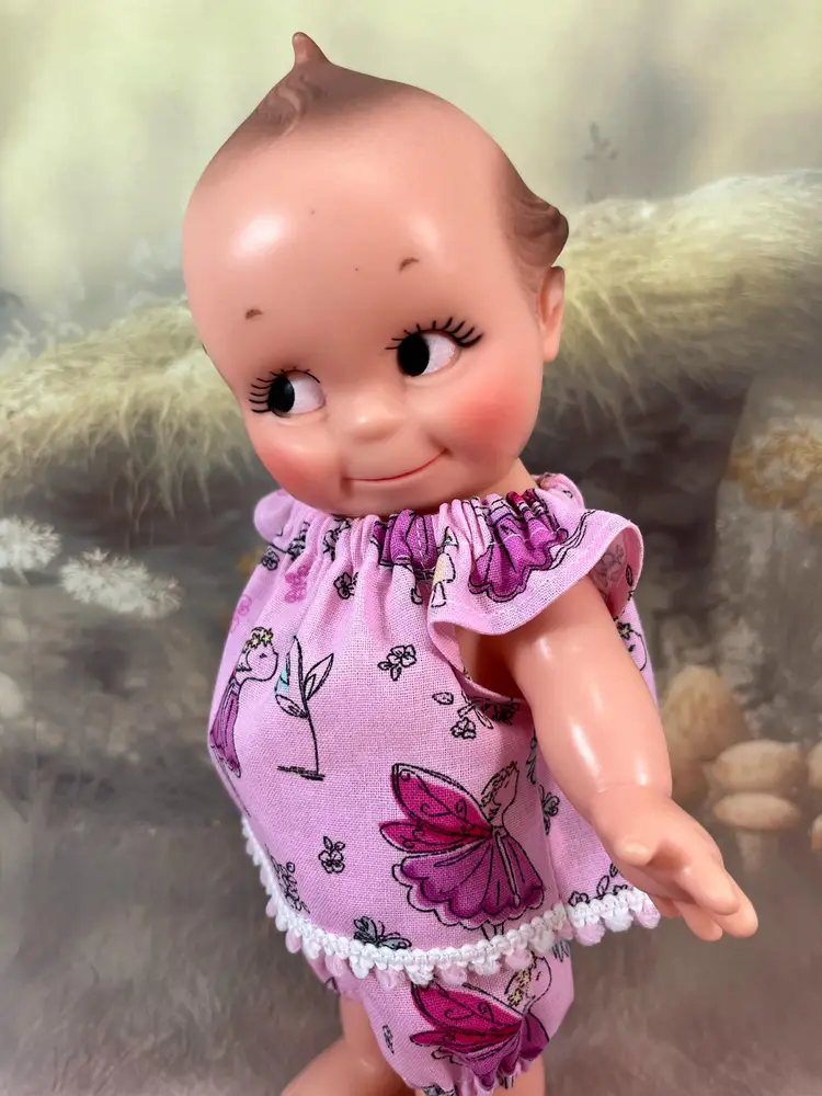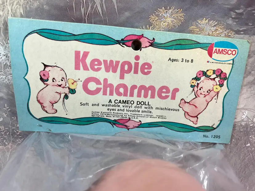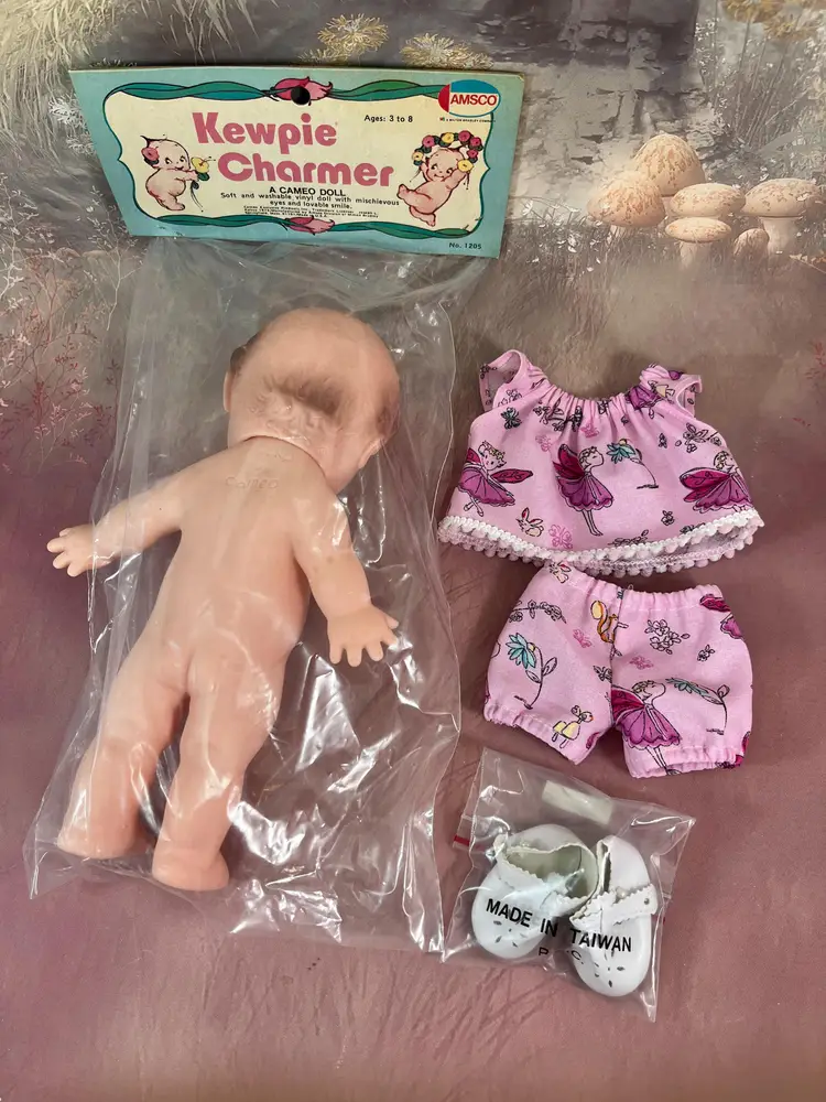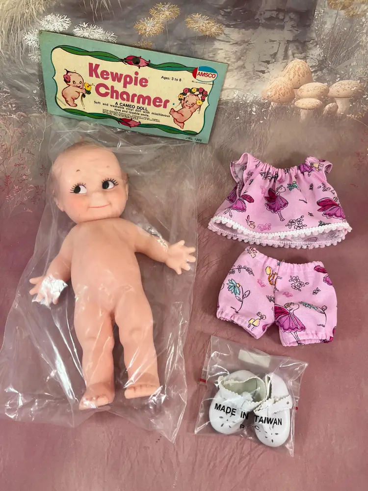 This is an unopened, new in package, 10" vintage Kewpie Charmer doll dated 1974. Kewpie is a vinyl doll. You will receive the unopened doll (not the clothing model), new handmade outfit, and new shoes in unopened package.