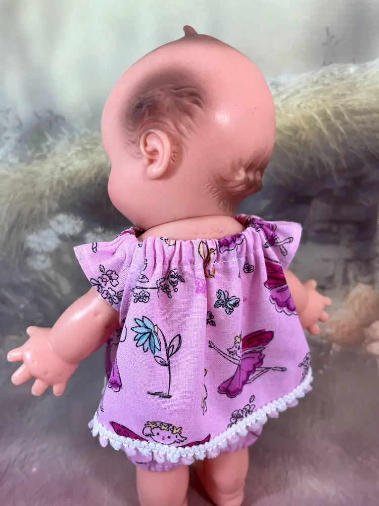 The outfit is handmade by me. The dress has an enclosed elastic neck and pulls onto the doll easily feet first. The bloomers have an encased elastic waist and encased elastic leg openings. The dress is made with quilter's cotton fabric. All seams are either serged or fray checked.