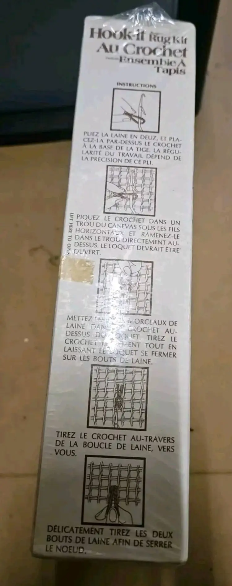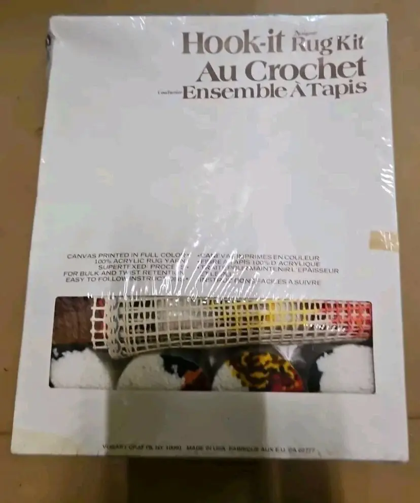 The kit includes everything needed to create a beautiful latch hook rug, including pre-cut acrylic yarn, a printed canvas, and complete instructions. This kit is perfect for any fan of the Shirt Tales or vintage crafting.