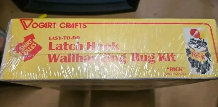 This vintage 1980 Vogart Crafts Latch Hooking Kit features the lovable character Rick Raccoon from Hallmark Cards' Shirt Tales. The kit is brand new in its original packaging and was made in the United States.