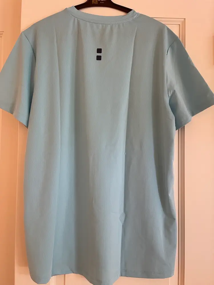Photos and lighting made color look pale blue but photo of shirt tag represents true color. Cooling Blue is a vibrant baby blue color.