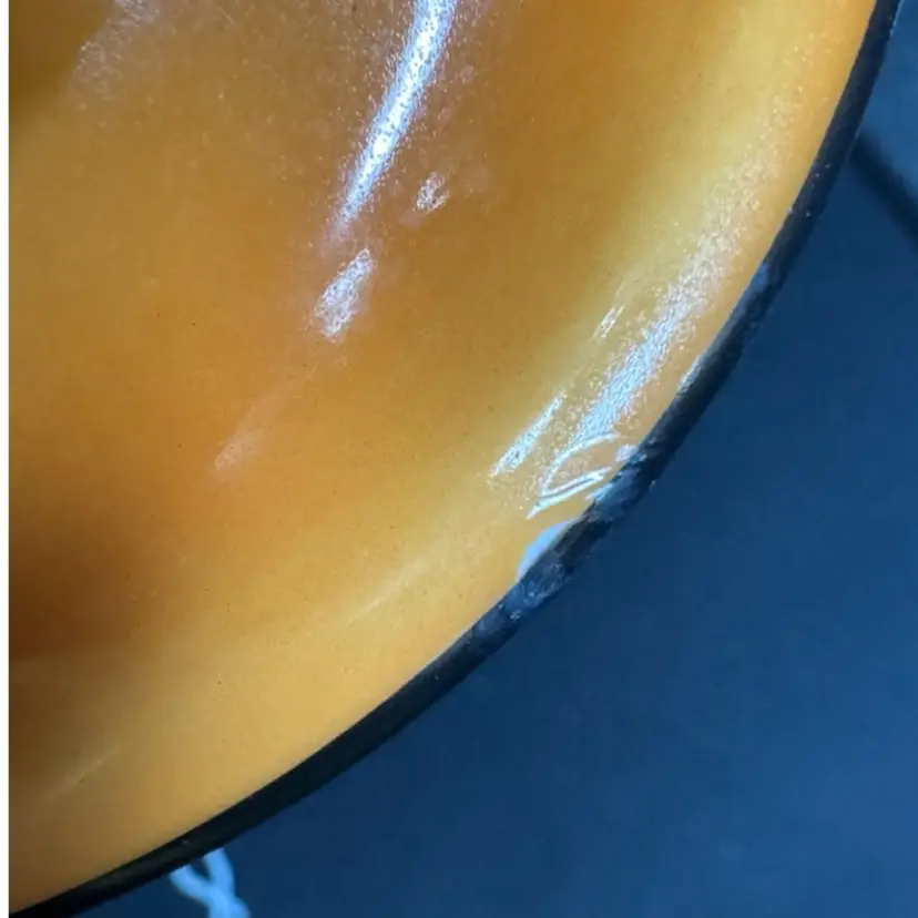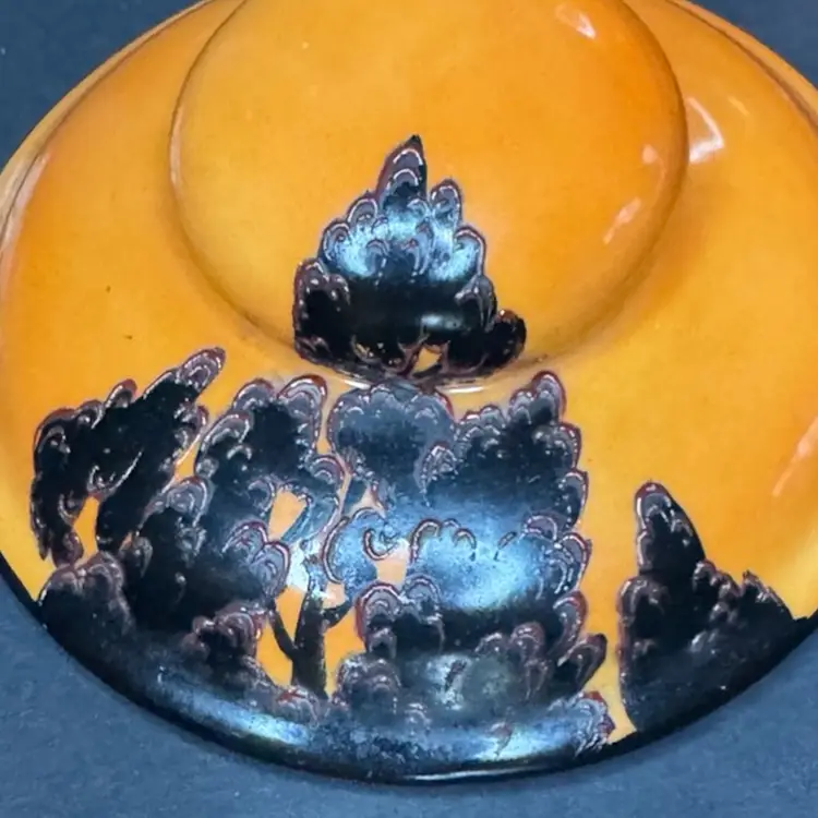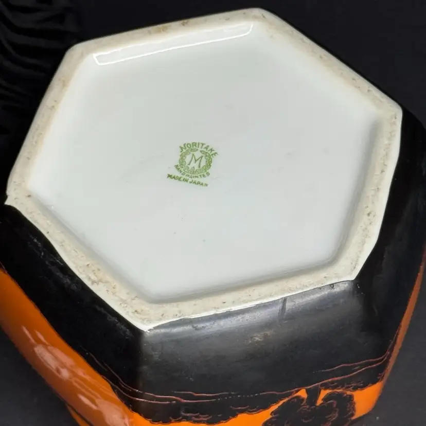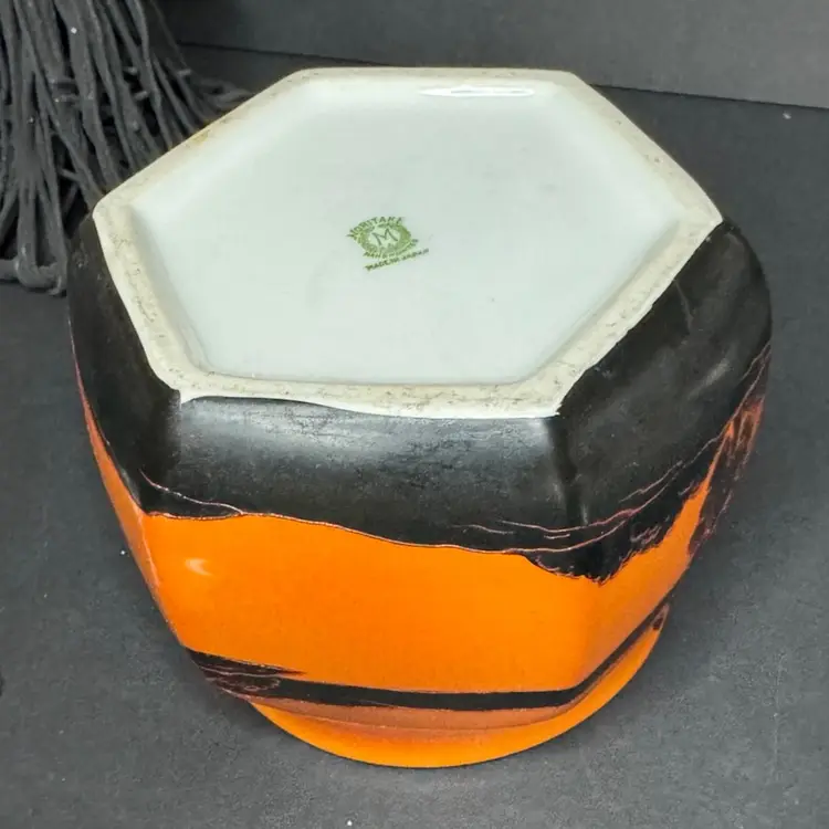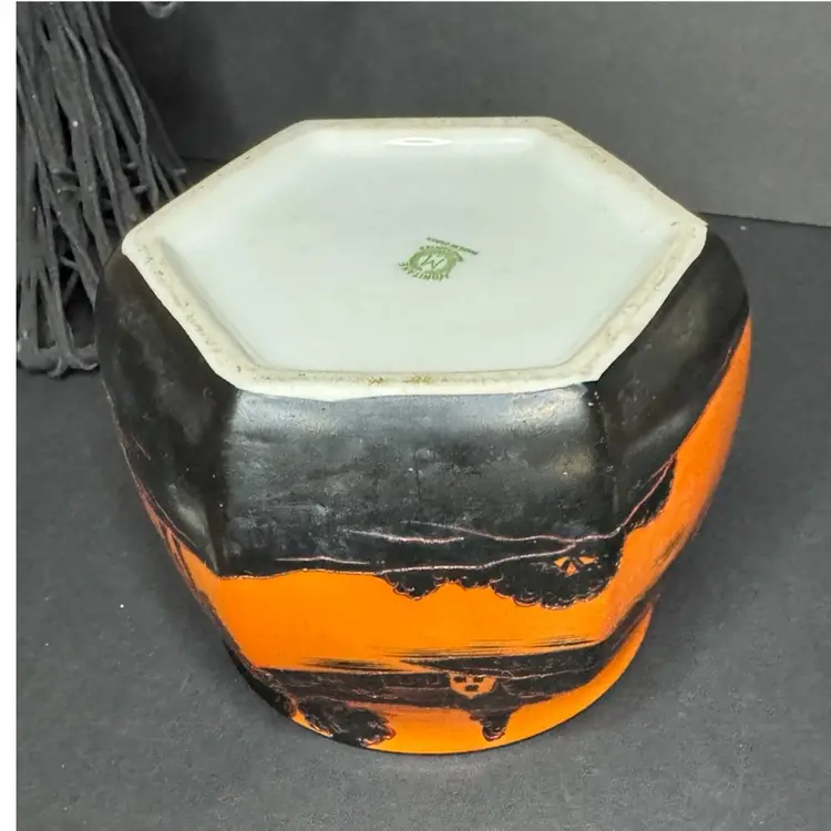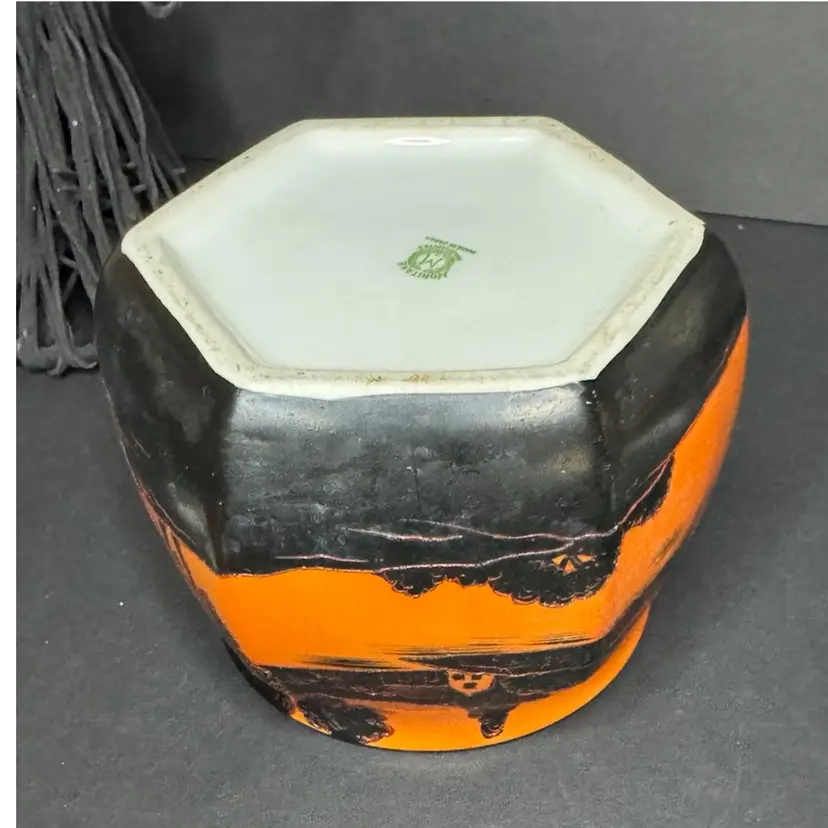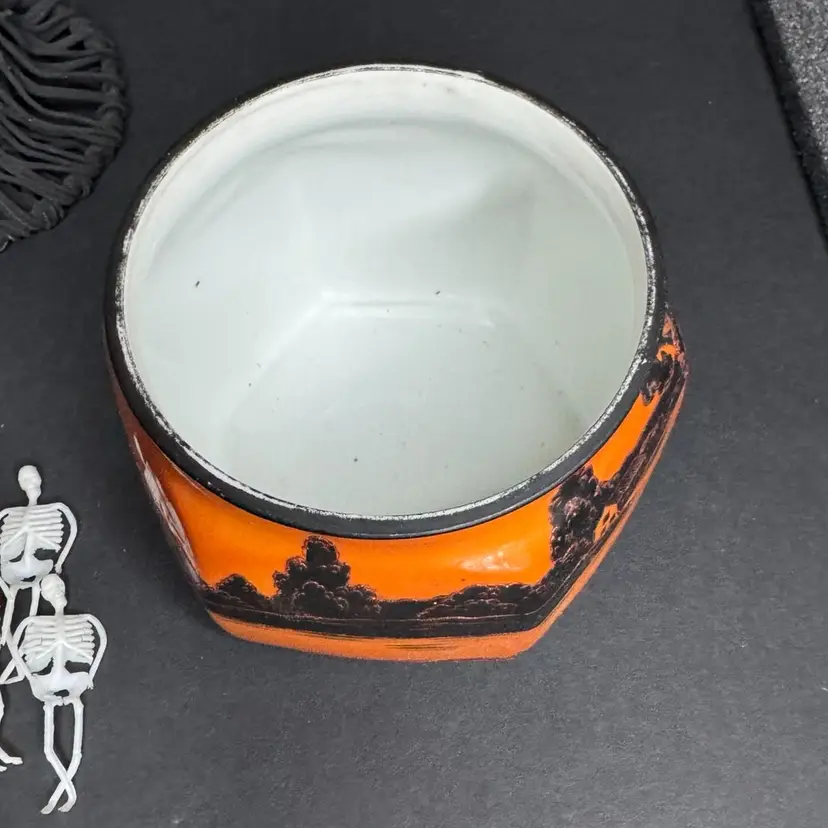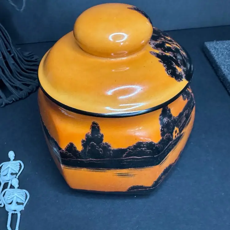 This is such a beautiful tea/biscuit jar that could be used for Halloween decor and all year decorating and use. There is one tiny tiny possible chip with a tiny bit of orange paint missing. Not visible when looking at piece but there is a picture included to show this area. The overall paint is in excellent condition and very vibrant and the hand painted black areas are in perfect condition with great texture and dimension