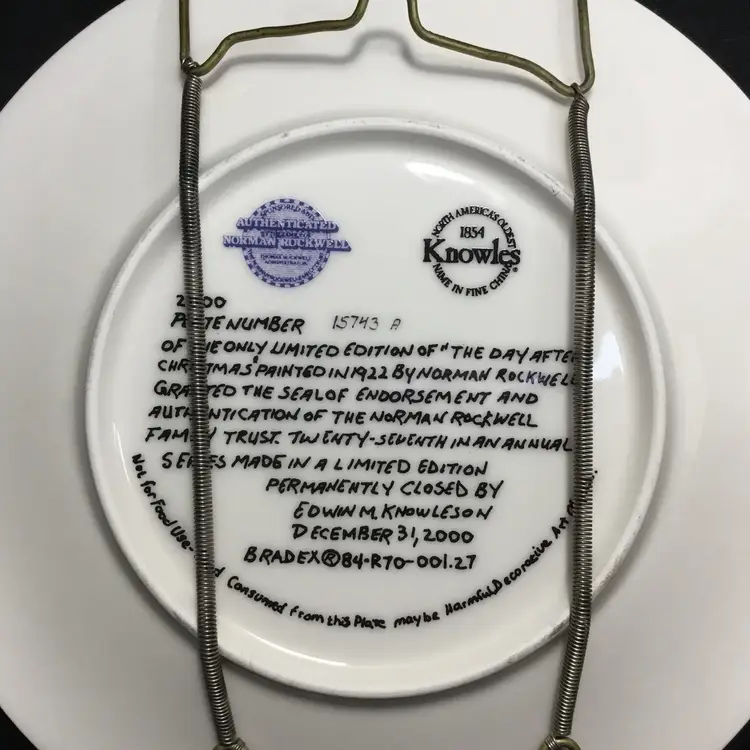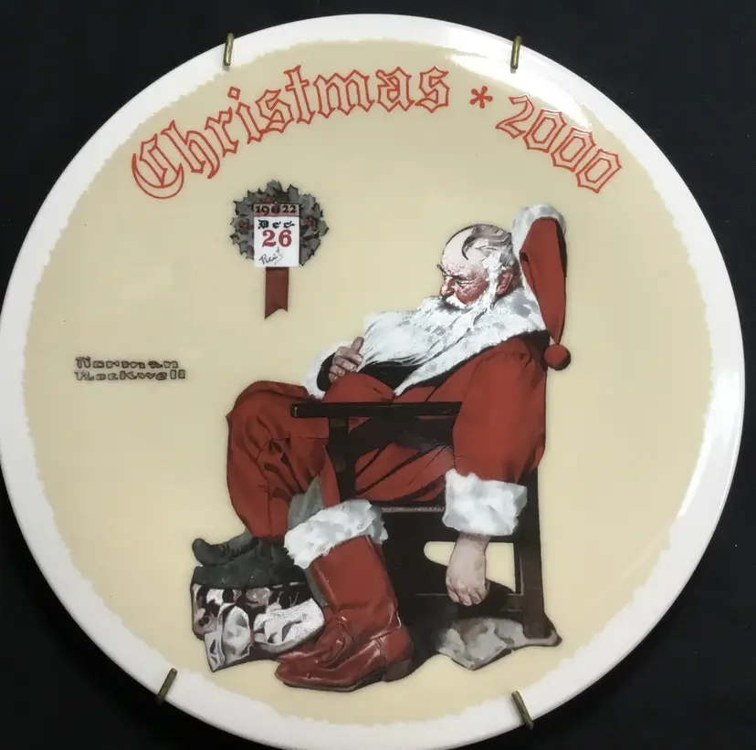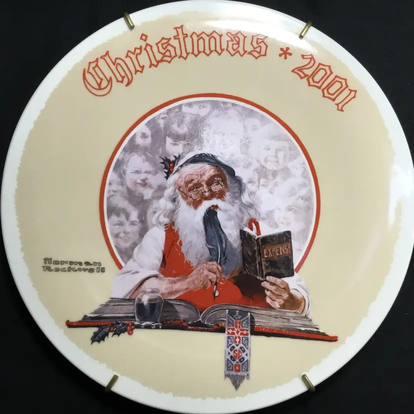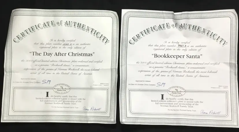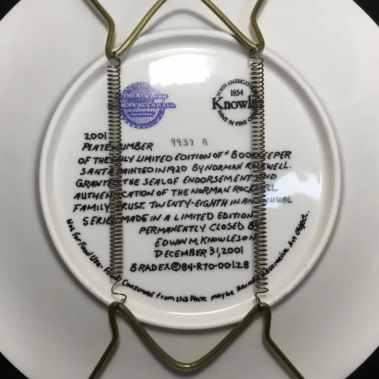 Lot of two Knowles brand, fine china, Norman Rockwell collector plates, approx. 8 inches in diameter. Both are Christmas scenes. 2000 plate #15743 R is called "The Day After Christmas." It features Santa napping in a chair, hat hung on one side, boots on the floor, feet on a footstool. Calendar on wall says Dec. 26. 2001 plate #9937 A is called "Bookkeeper Santa." It features Santa at his desk, a quill pen in hand, large book opened on his desk next to inkwell. Santa is looking at a small book titled "Expense" Both plates have 2 stamps of authenticity, Knowles company, and Family of Norman Rockwell. Metal stretch spring wall hangers are included. COAs are included.