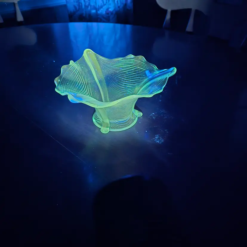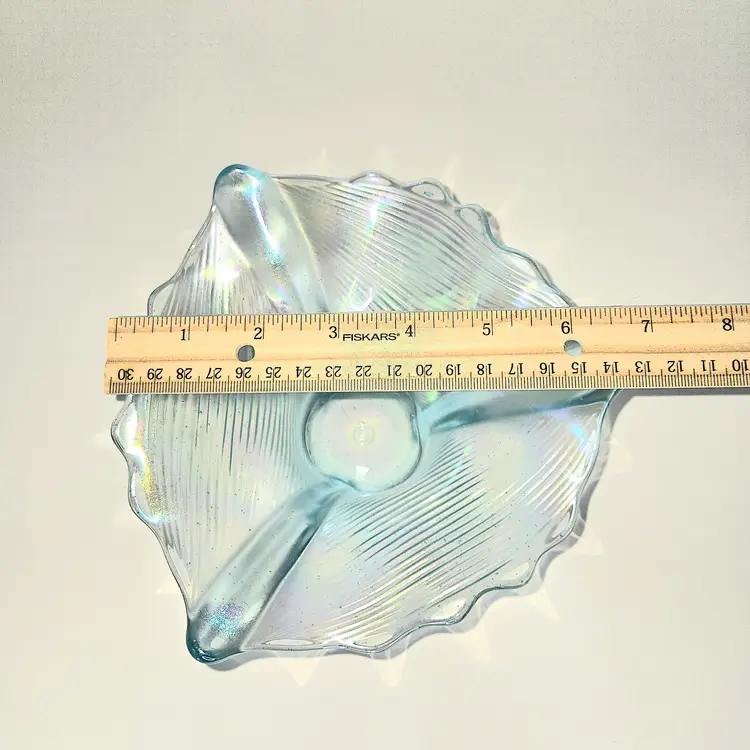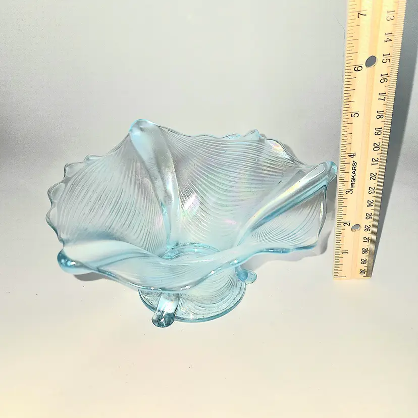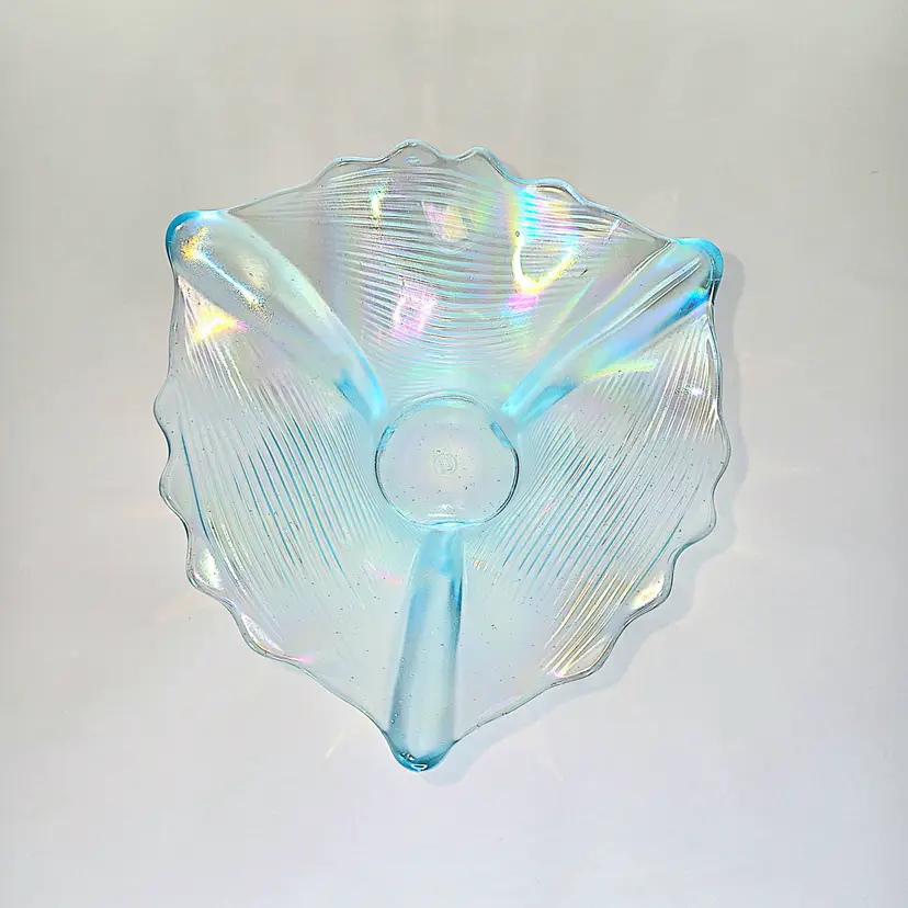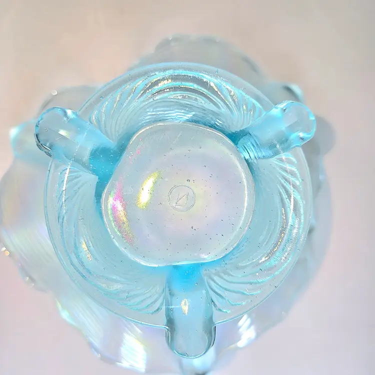 Absolutely flawless and beautiful carnival glass in the rare ice blue color. Circa early 1900's. Glows green under 365 UV light.