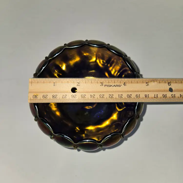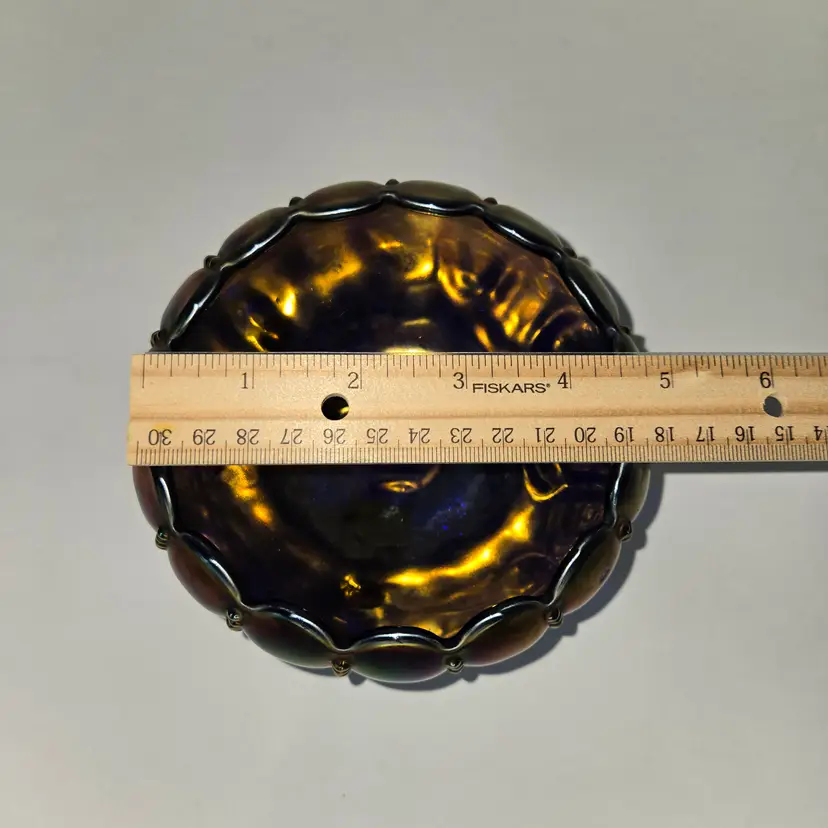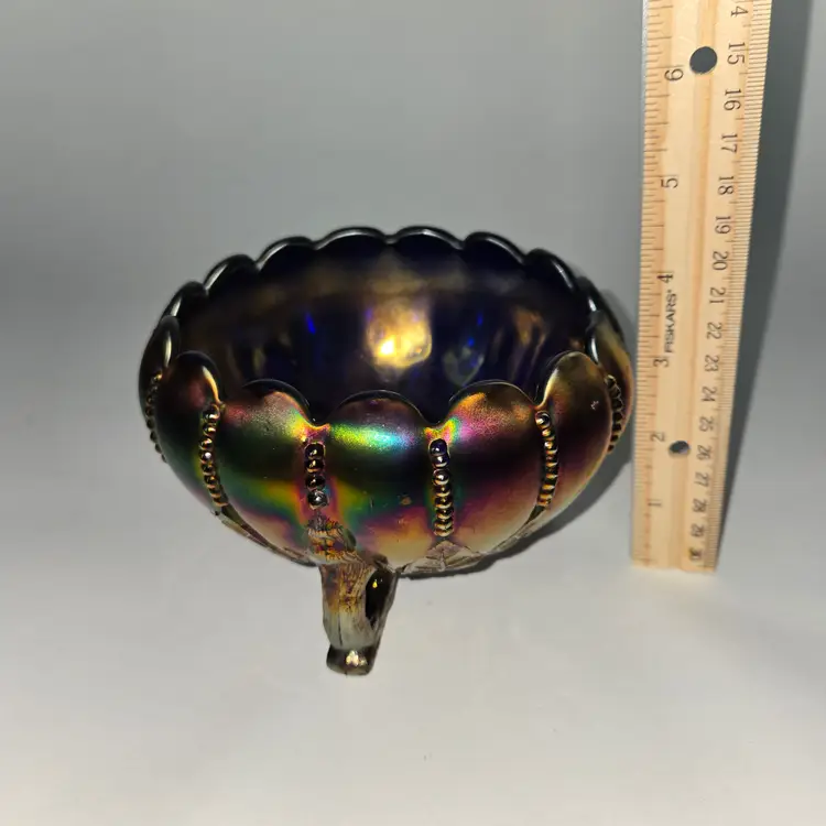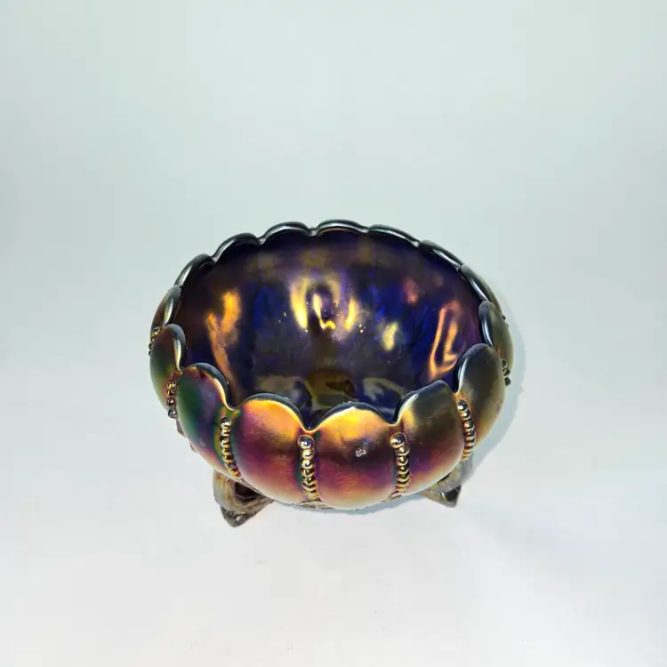 This carnival glass rose bowl is in excellent condition and a beautiful sapphire when held to light. No fleabites, chips, cracks, or loss of iridescence. Footed.