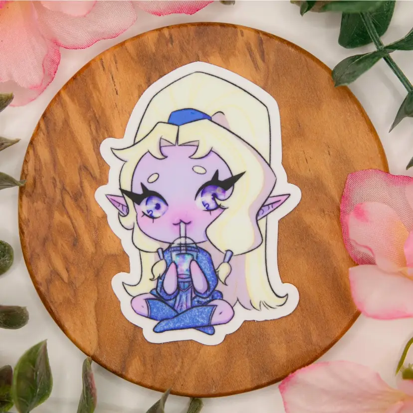 Nova is my current dungeon and dragons character who is currently helping a fallen star save their far off world. In this sticker she is drinking a space boba from her favorite childhood restaurant and is feeling a bunch of nostalgia !!
