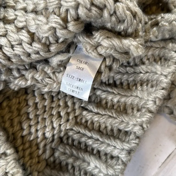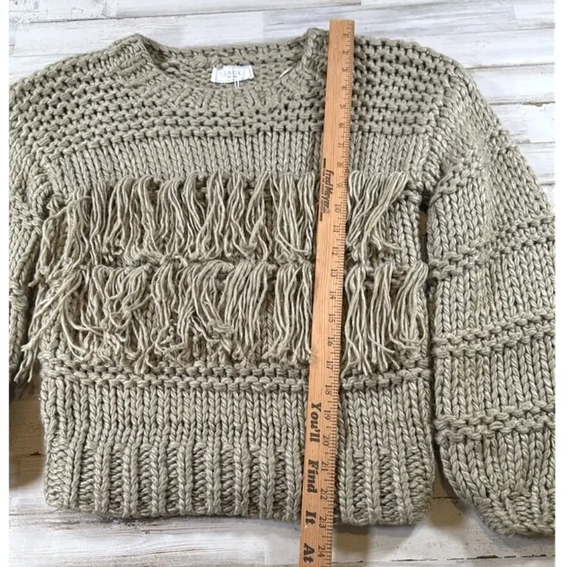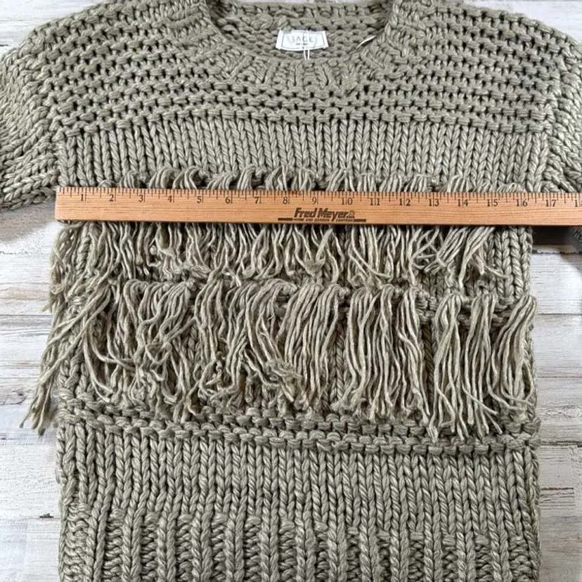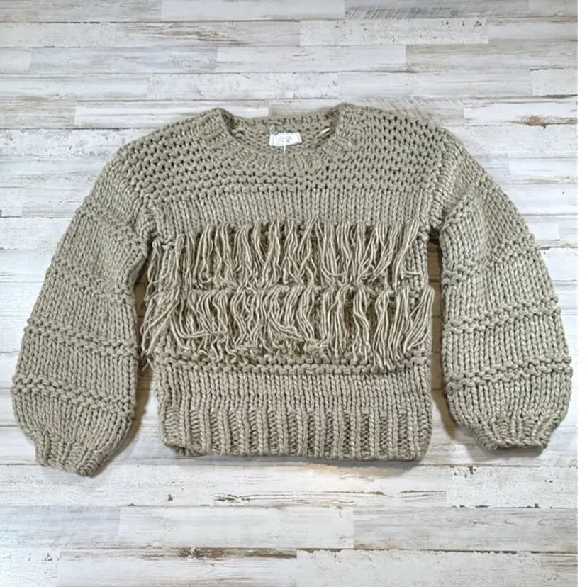 Make a statement with this Sage The Label chunky knit sweater in a soft tan. Featuring bold fringe detailing across the chest, balloon sleeves, and a cozy crew neckline, this sweater blends bohemian flair with modern style. This is a salesman sample, making it a rare find you won’t see everywhere. • Brand: Sage The Label • Condition: New with tags – Salesman Sample • Color: Tan • Size: Small • Material: Unknown – see photos for texture and knit details • Style: Chunky knit pullover • Neckline: Crew neck • Sleeve: Long, balloon-style sleeves • Details: Fringe embellishment across front