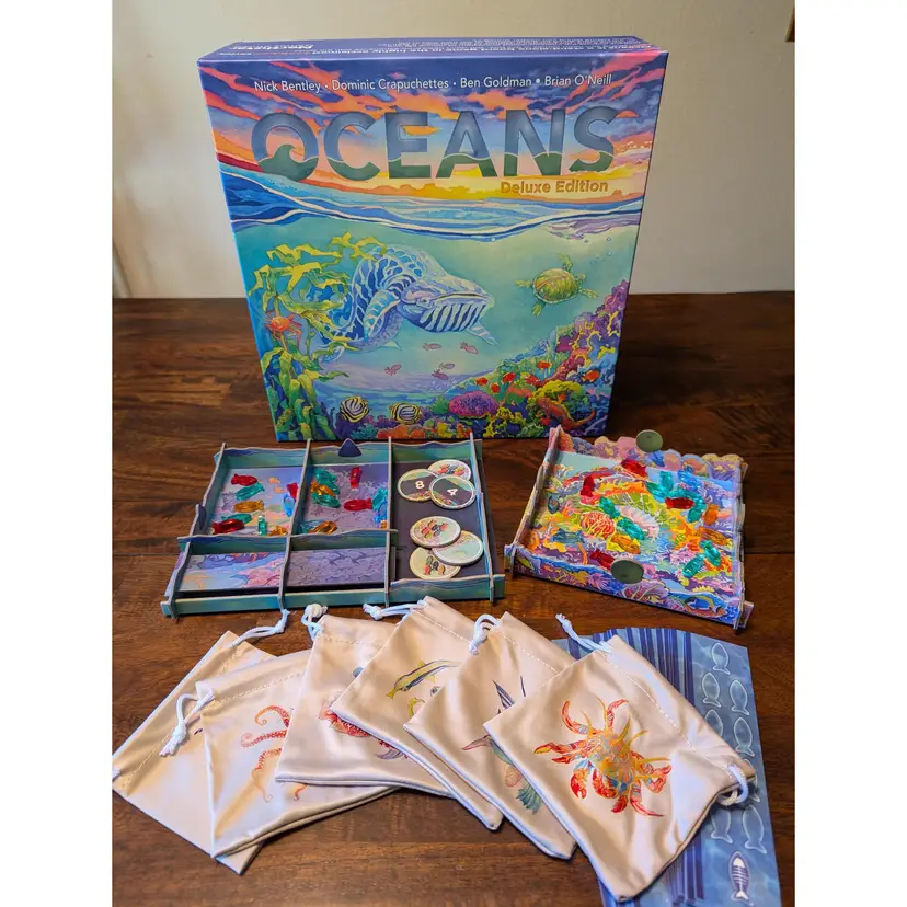 Includes deluxe components: acrylic fish, foil cards, printed score bags, customized card sleeves.