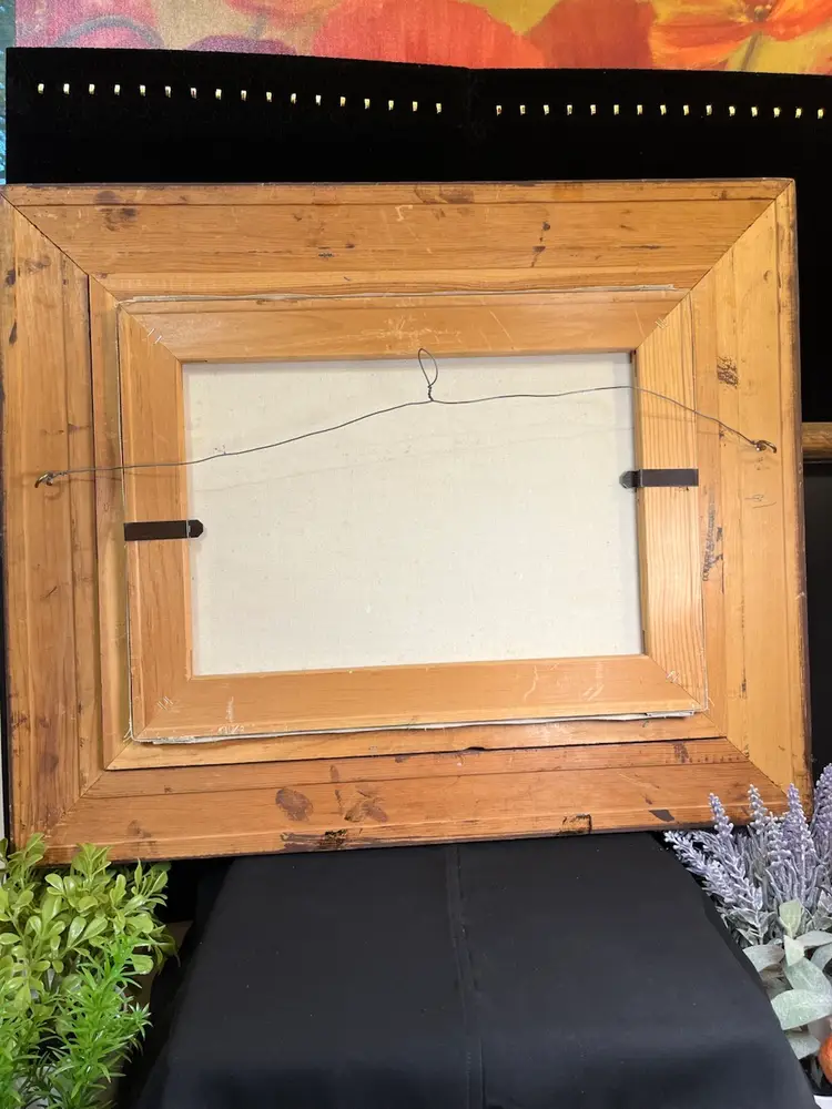 Someone did a fabulous job on this. It is matted and framed. There is a signature in the bottom R corner but is covered by the beautiful wood w/ carving frame. (Peeking down at the signature and gently pushing canvas back it may read "Roller" ?) Has a wire on back for hanging. The frame measures approx 19" x 23" and weighs approx 4 Lbs
