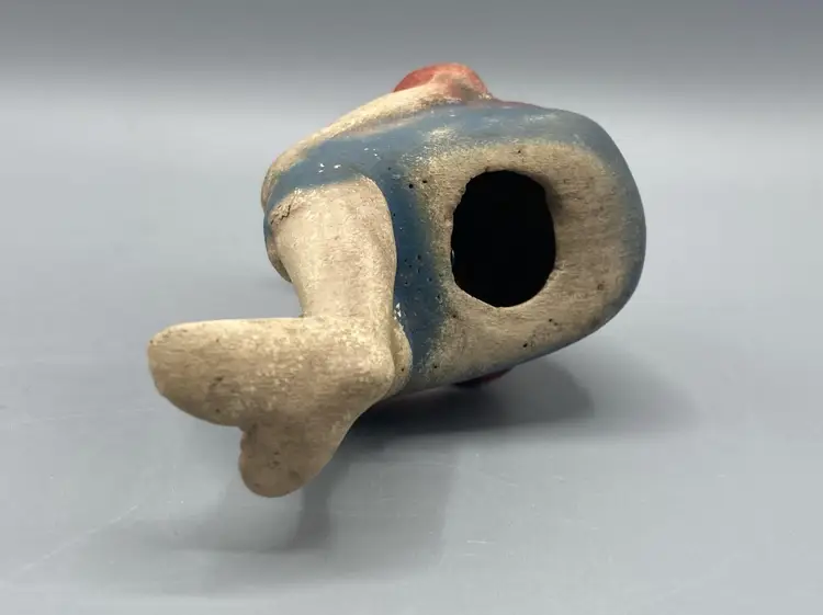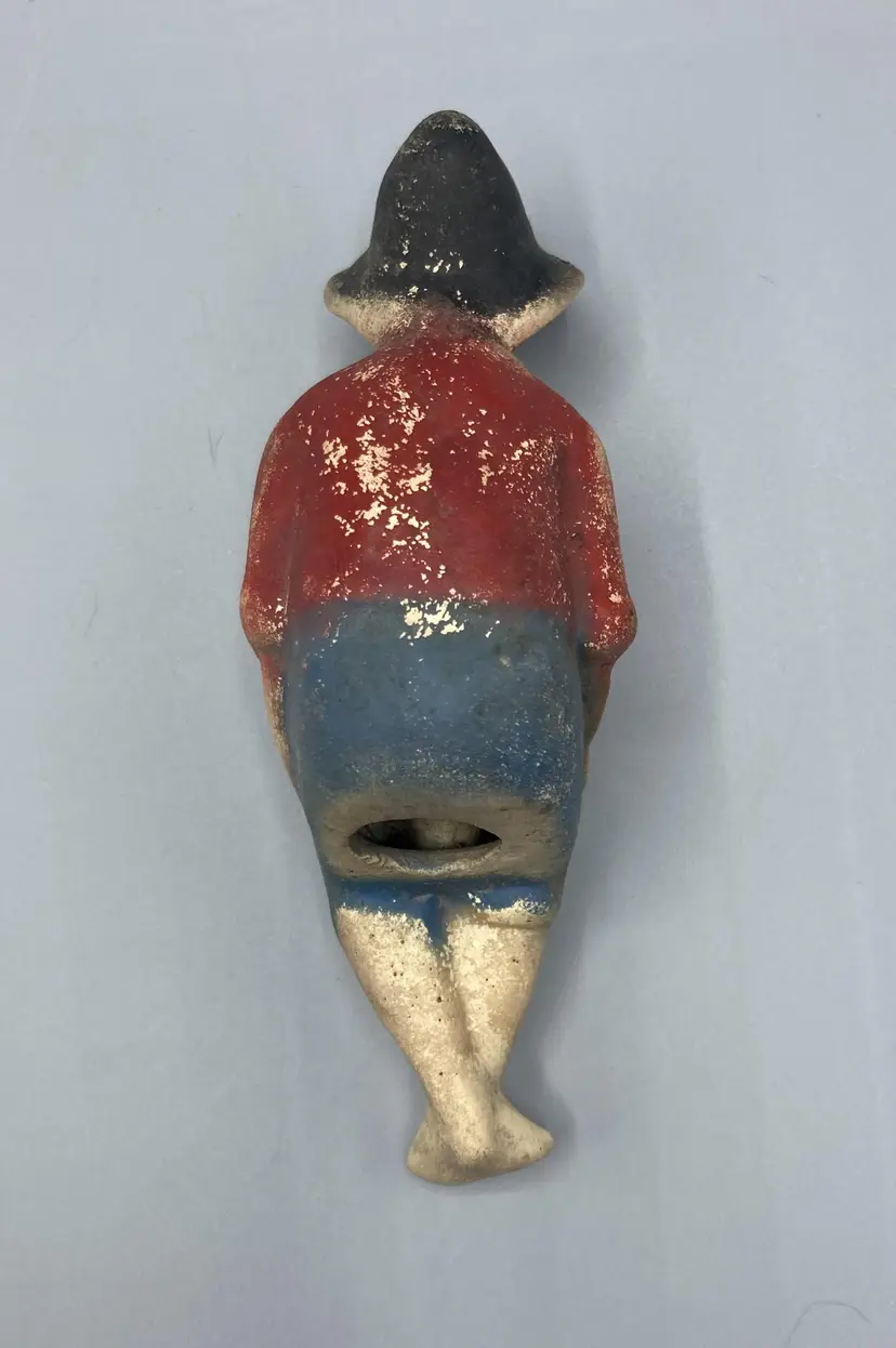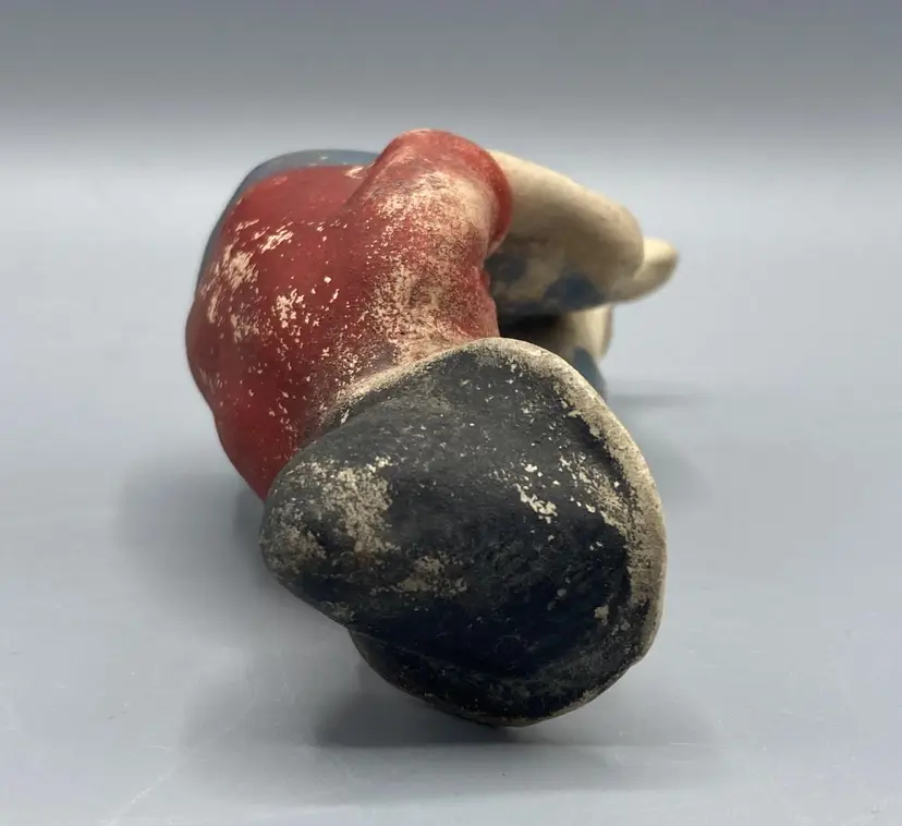 This boy shelf sitter was originally made to sit on the edge of a fishbowl or aquarium. However, this does have a flat bottom that can sit on a shelf or at a pond, etc. I would recommend securing it at the bottom with something so it does not fall over as he isn't the most stable shelf sitter. This figurine is missing his fishing pole and the bench it had originally. The color is wearing quite a bit. And it has stains that were most likely caused by sitting outside in the weather. Please see pictures for specific details. It measures approximately 5" tall.