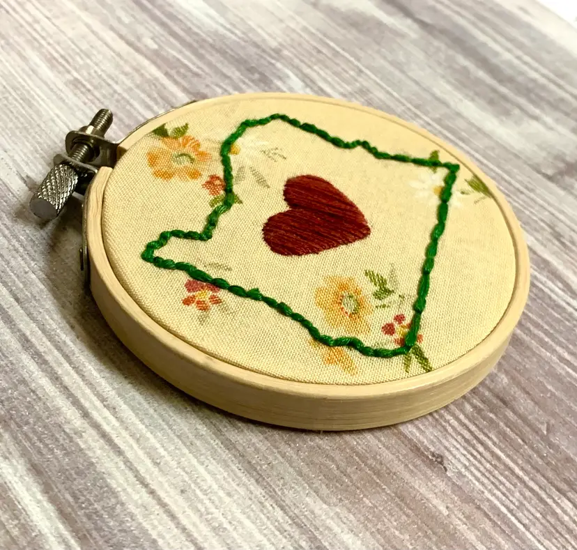 This Oregonian tribute is hand-stitched on cotton fabric and secured in a bamboo hoop. Measures 3" across.