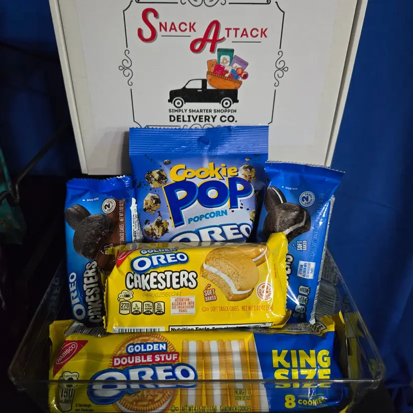 OREO Golden DBLStuf Cakesters (golden, chocolate, original) & Popcorn. In a giftable Snack Box.