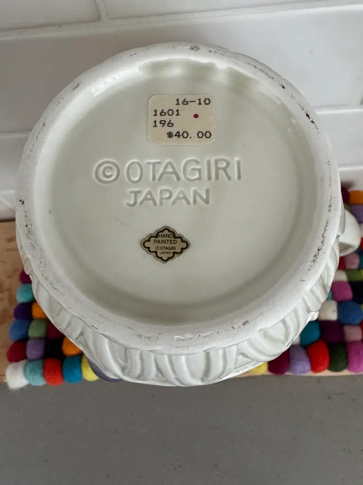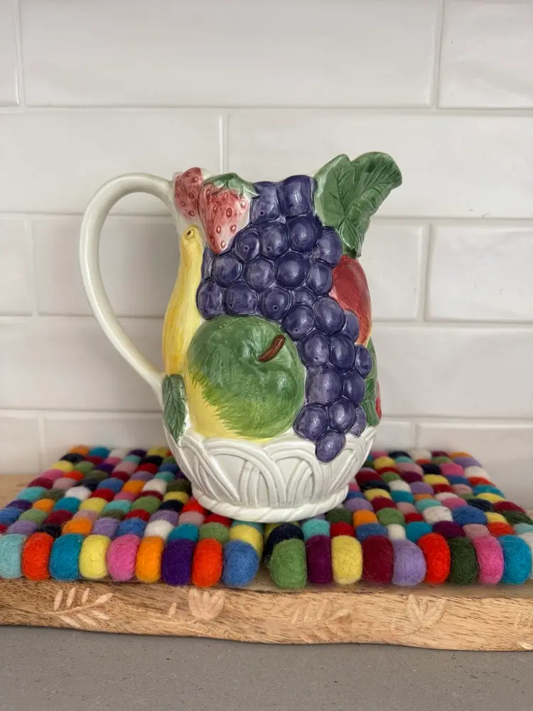 Vintage pitcher featuring a hand-painted, sculpted 3D fruit design, including apples, grapes, and other fruits. Made of high-quality ceramic, it is both functional and decorative. It is part of the "Fruit Basket" collection by Otagiri In perfect vintage condition with no chips, cracks or repairs Original sticker & sale price on the bottom. Measures approx 8 x 8”