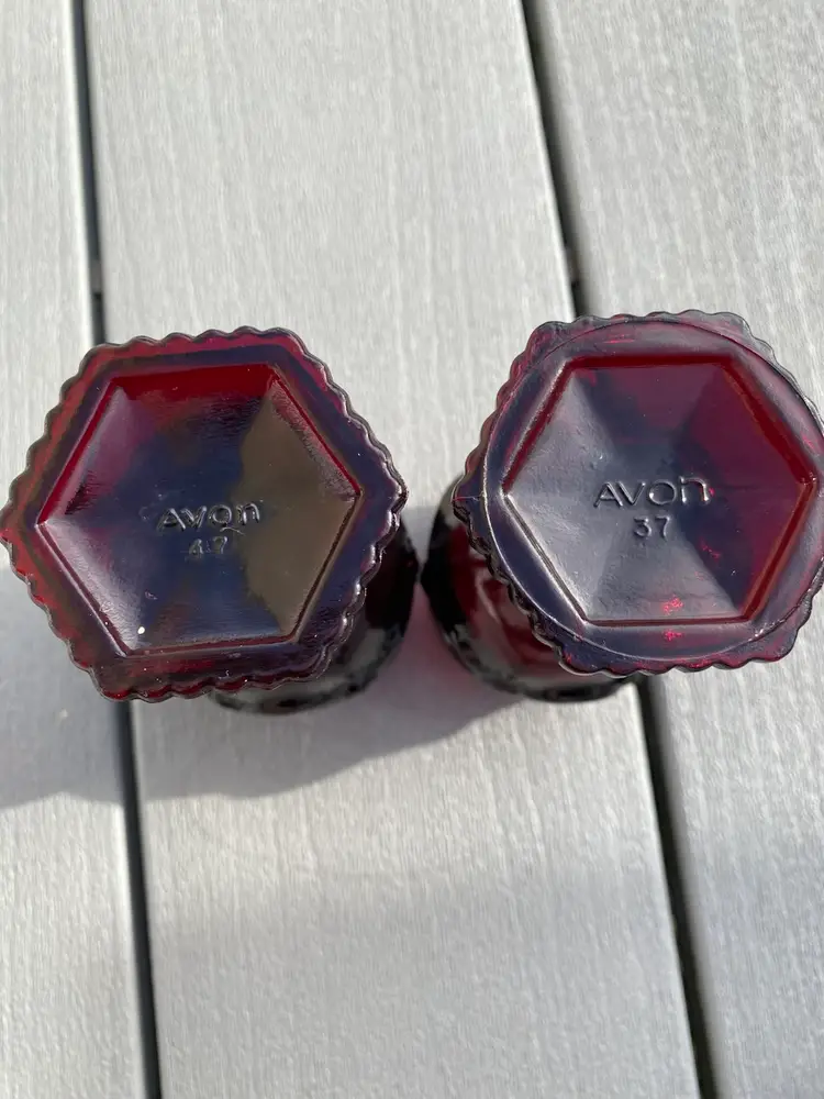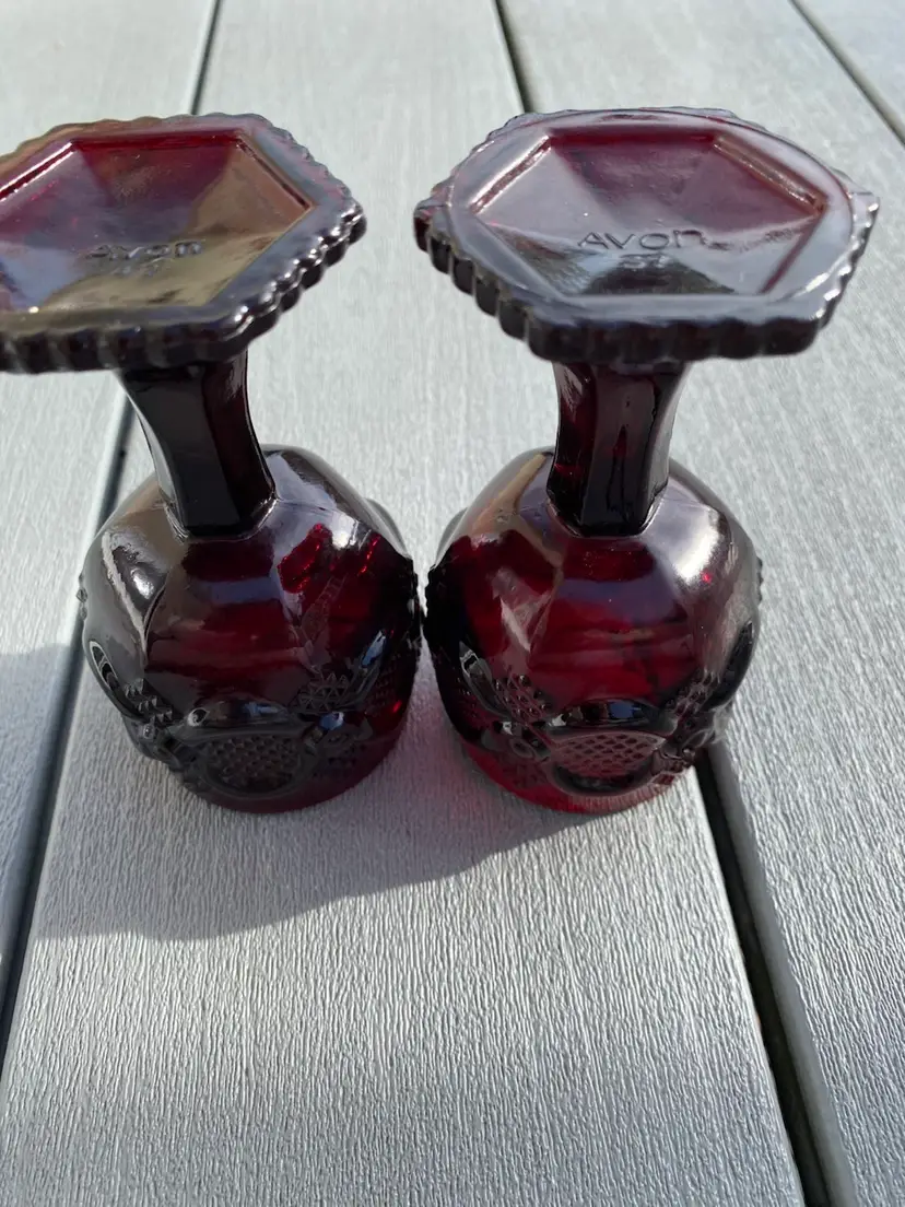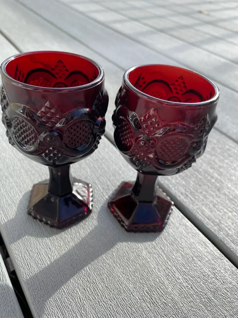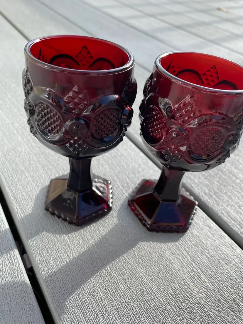 This is a pair of highly collectible AVON 1876 CAPE COD COLLECTION RUBY RED GLASS GOBLETS or wine glasses. The Cape Cod collection was produced by Avon from 1975 to 1993. The design is a reproduction of an 1800s Boston "sandwich glass" pattern inspired by the Roman Rosette pattern. The glasses measure approximately 4 3/4” tall with a 2 1/4” mouth opening in diameter and are in excellent vintage condition with no chips or damage.