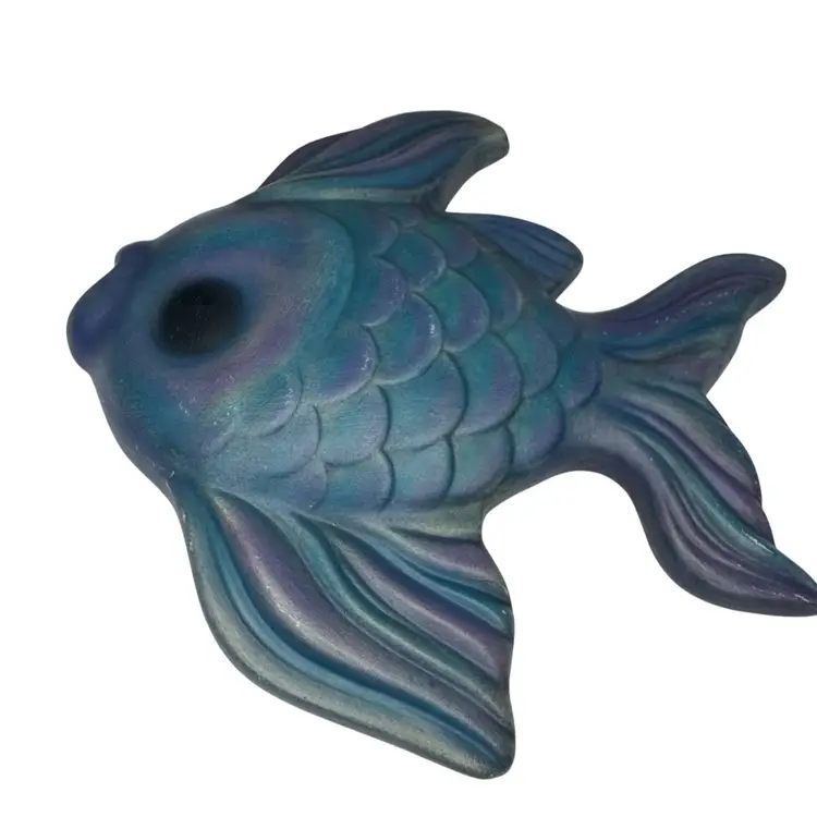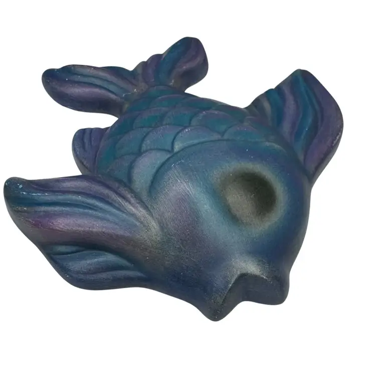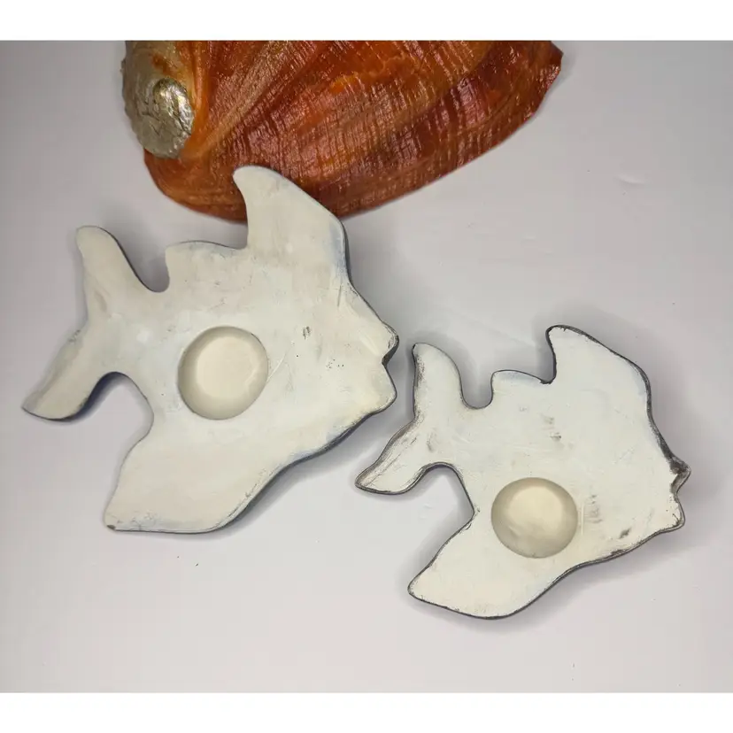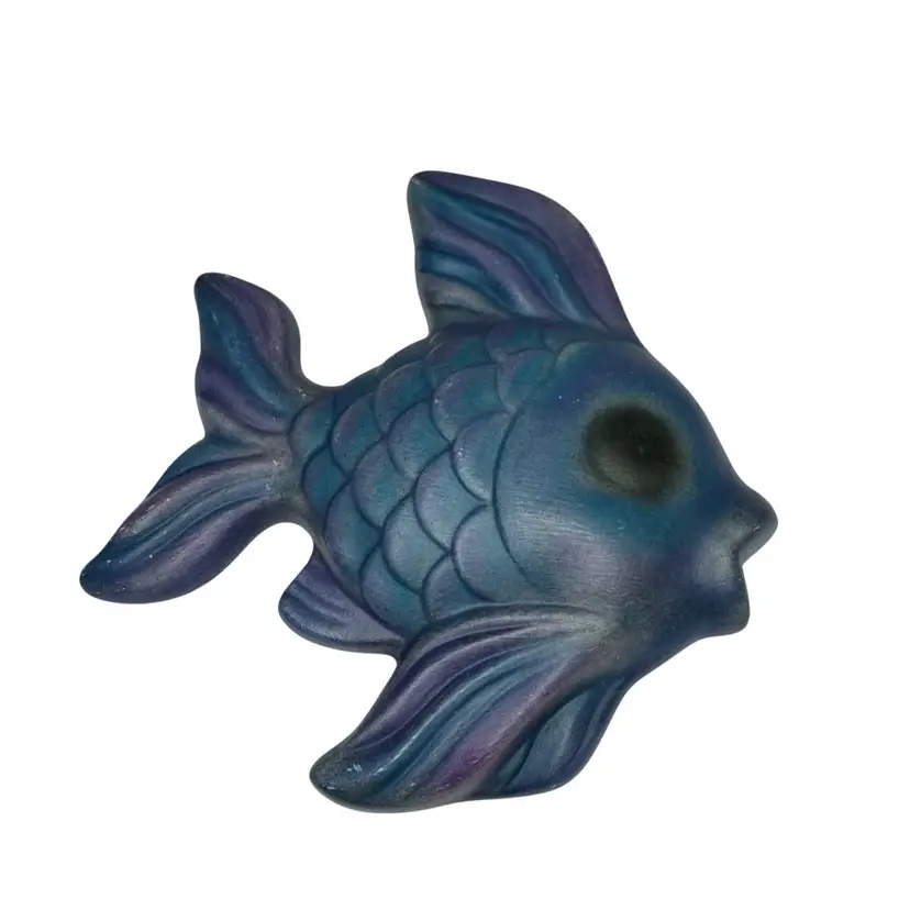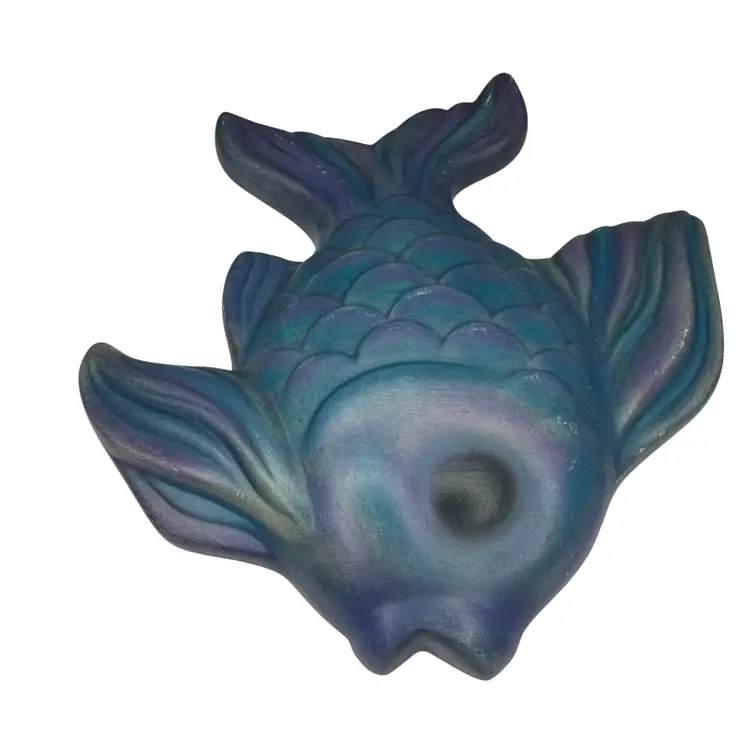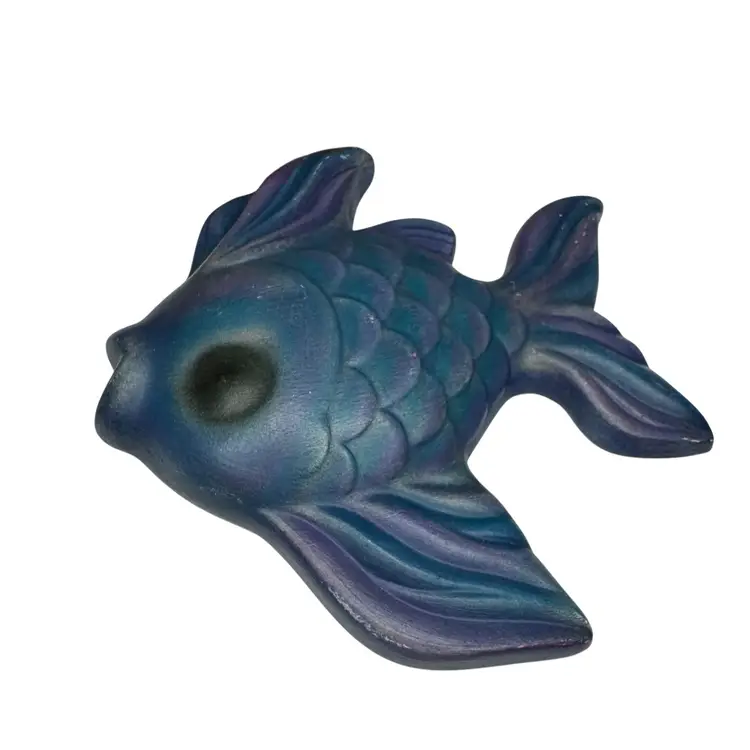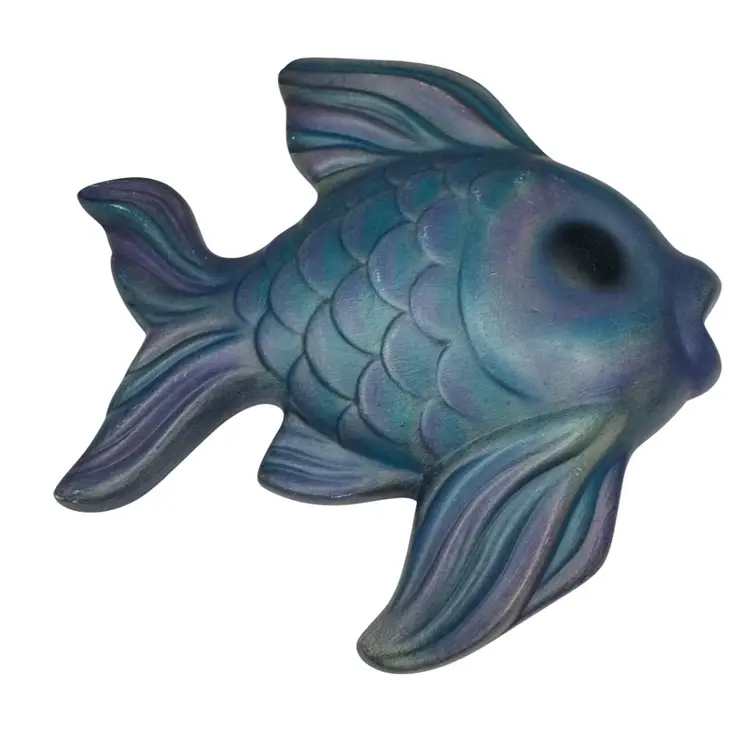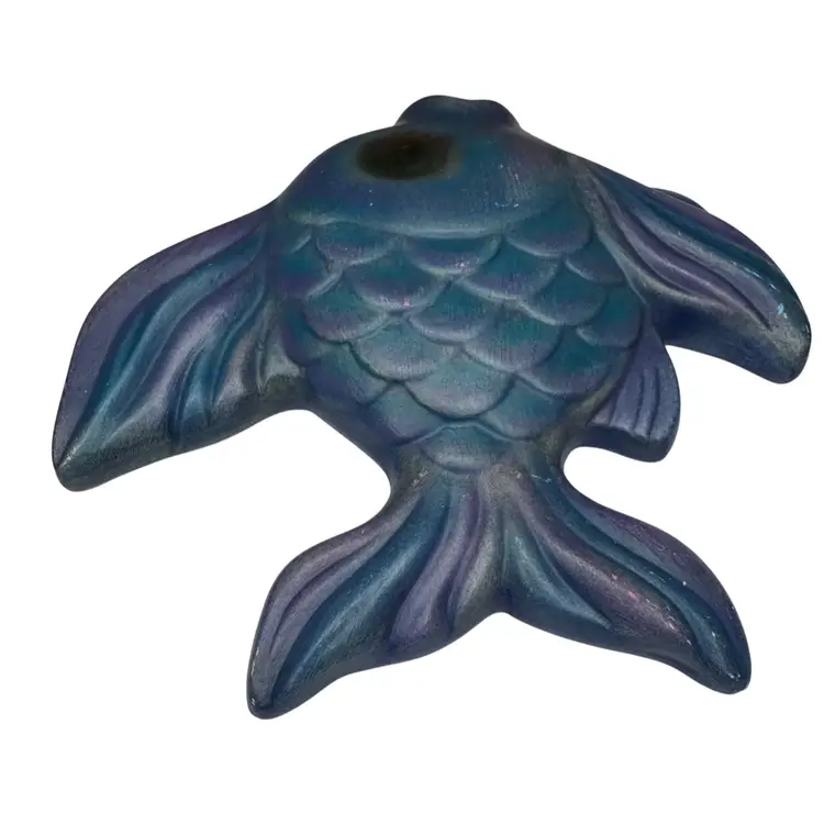 These two are adorable and painted in a beautiful color. Please see the pictures for the beautiful shading and condition. There is some wear which would be expected as these were used in decor for a mid century bathroom but there are no chips. The larger fish measures 7" x 6 1/2" and the smaller one is 5" x 5". These are not marked Miller Studio