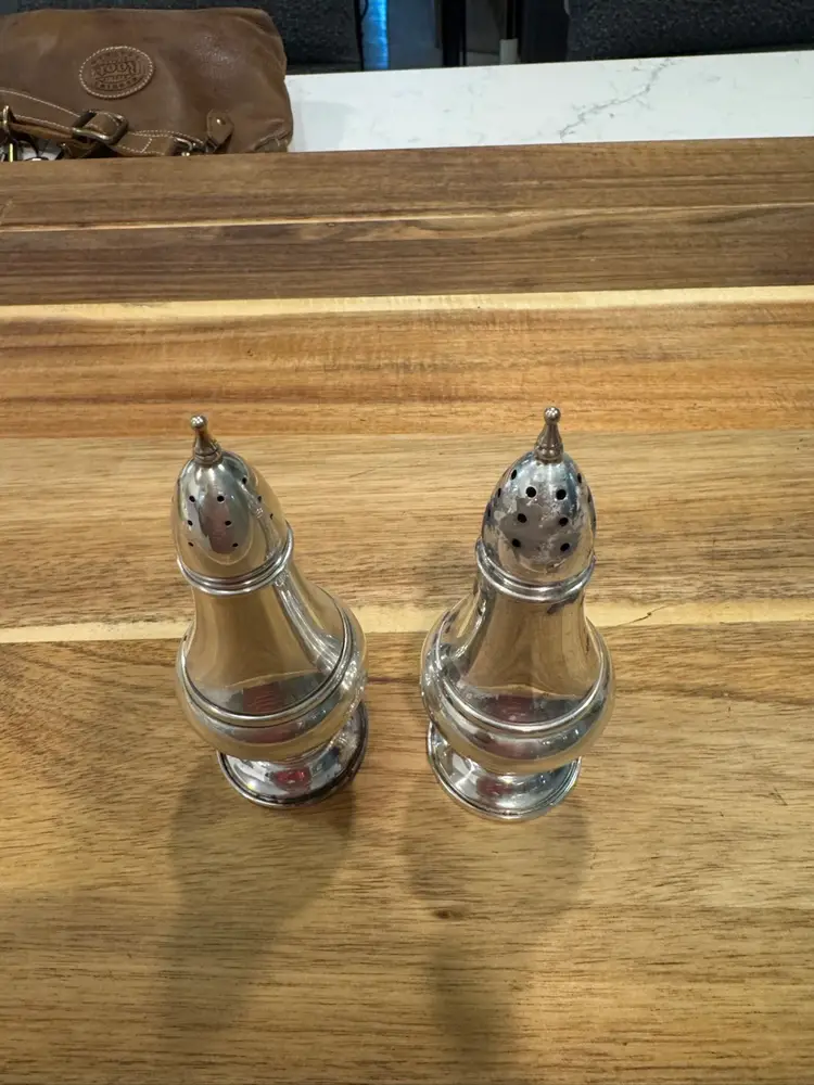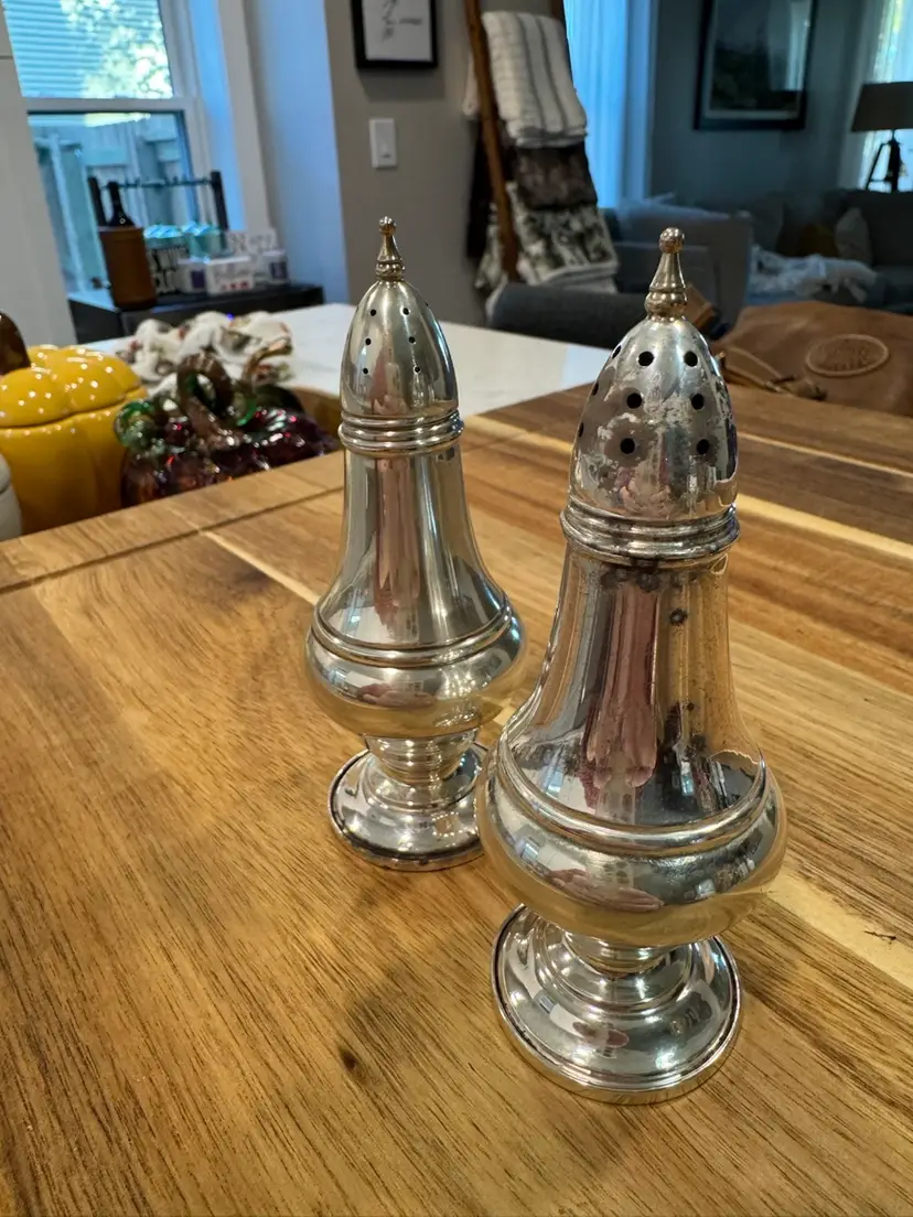 Elegant pair of antique sterling silver salt and pepper shakers. Circa 1900-1920. These classic pieces enhance any dining table with their timeless design and craftsmanship. Each shaker is made from high quality sterling silver, offering both beauty and durability. There is some corrosion on the salt shakers. Pepper in excellent condition. I HAVE TWO SETS.