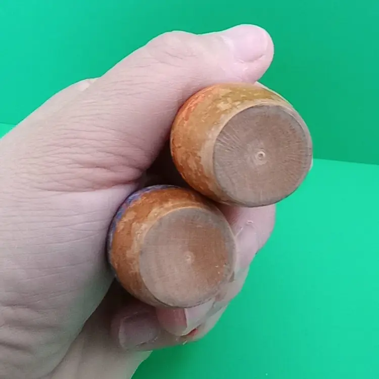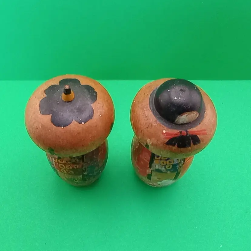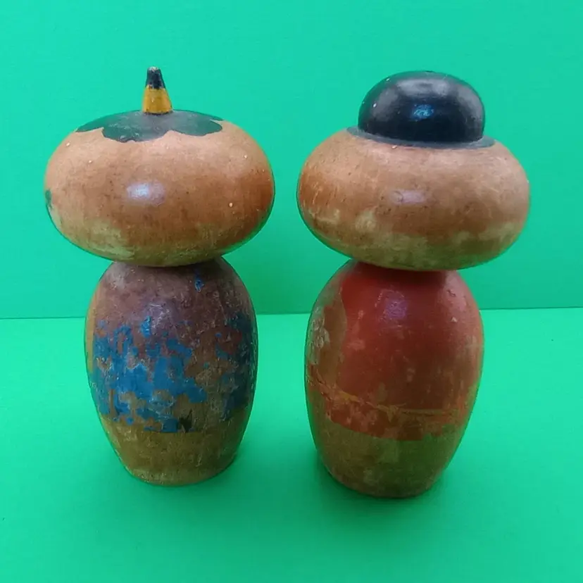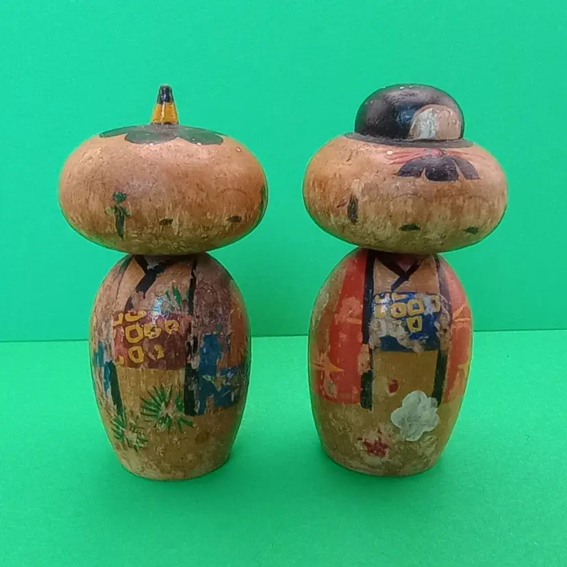 This is an adorable pair of vintage miniature bobble-headed kokeshi dolls. They have love handpainted detail and are in fair vintage condition with quite a bit of wear.