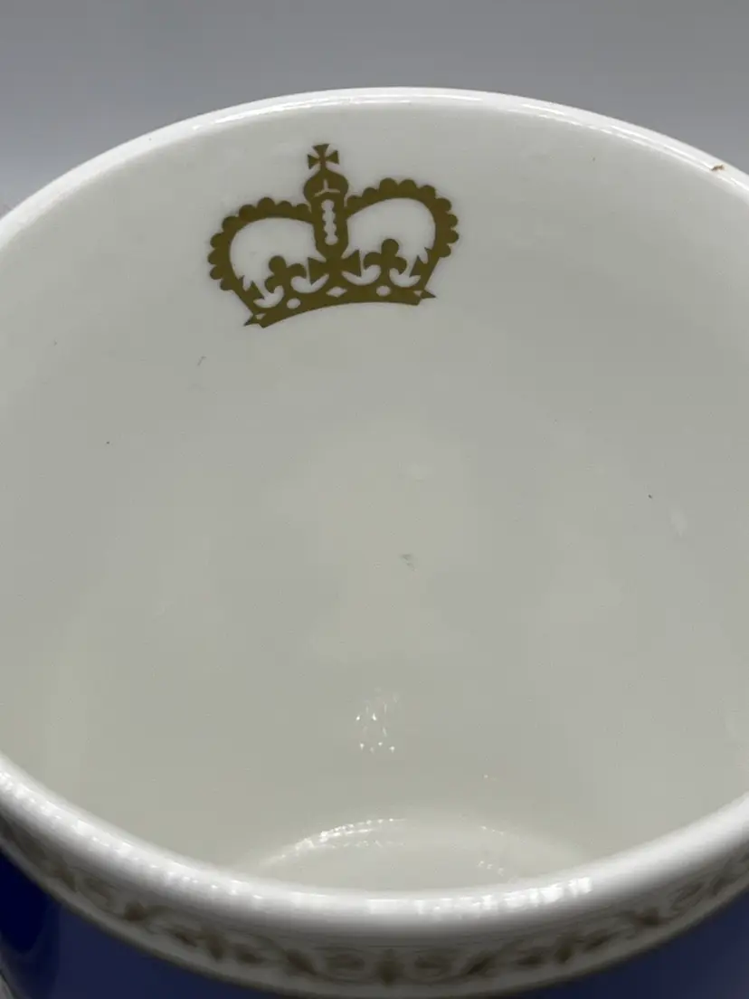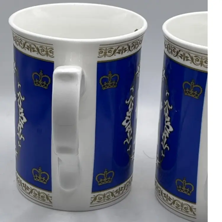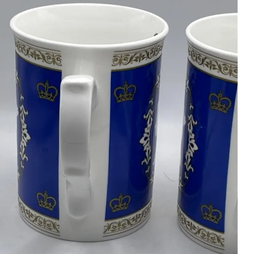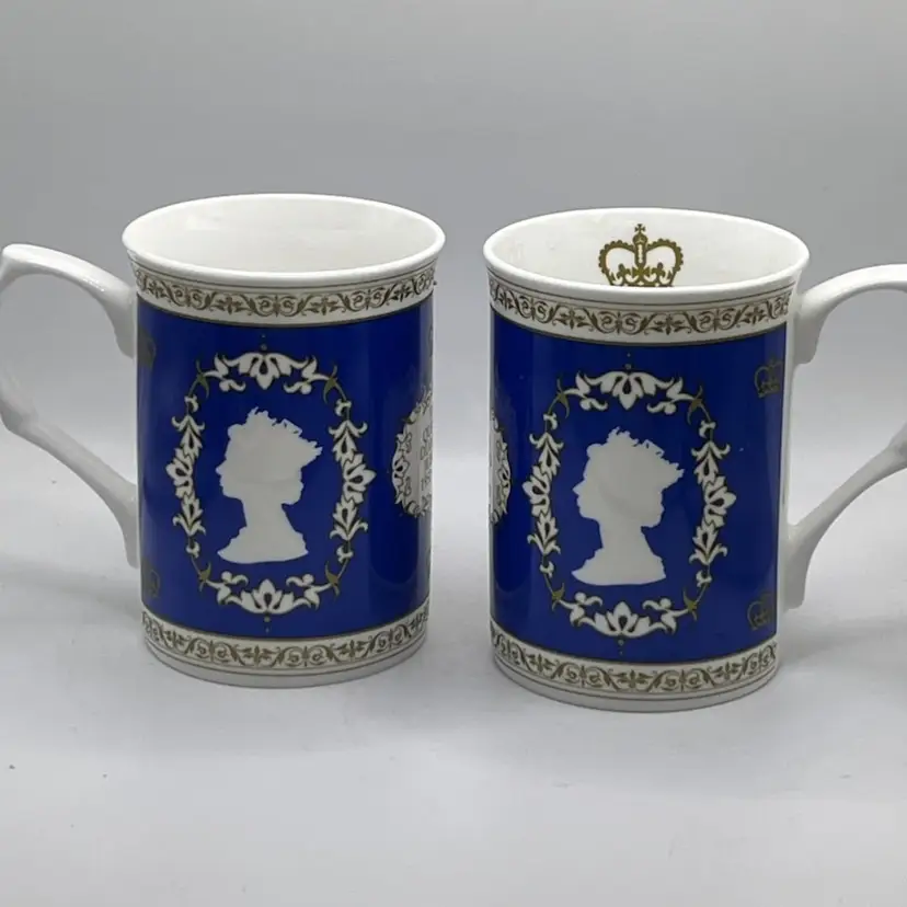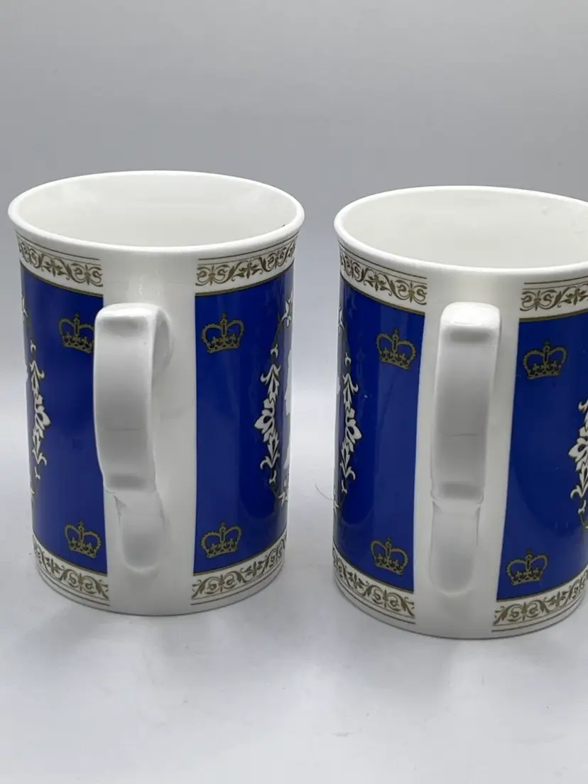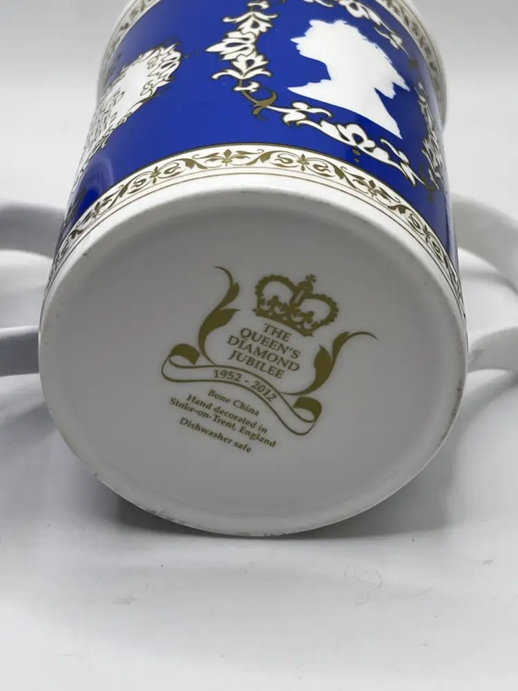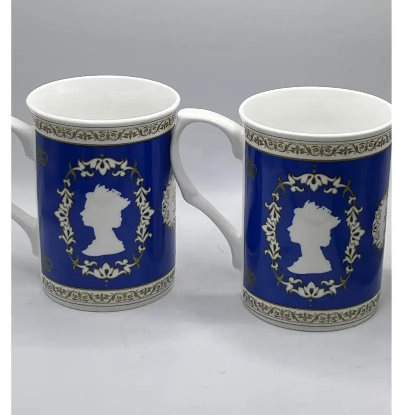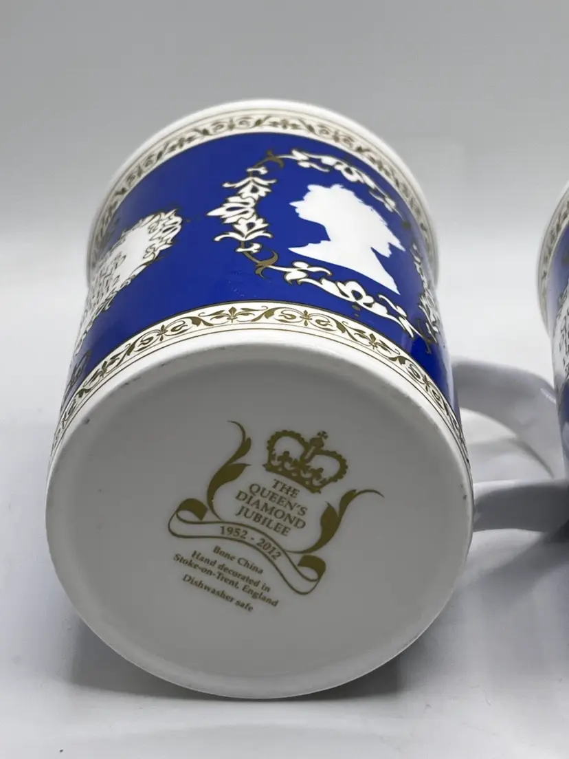 Made and decorated in England pair of bone china tea cups. They celebrate Elizabeth II diamond jubilee. Beautiful tribute mugs each hold 12 oz.