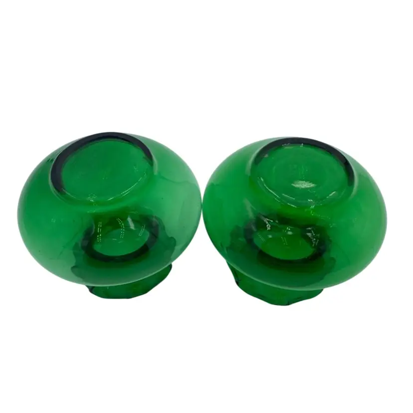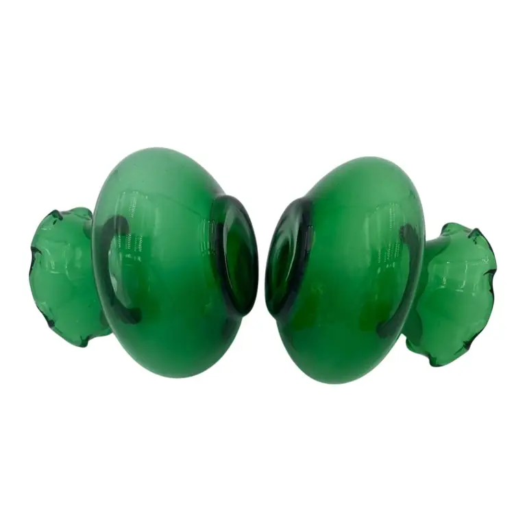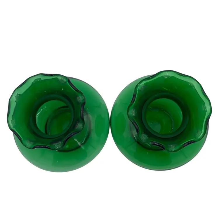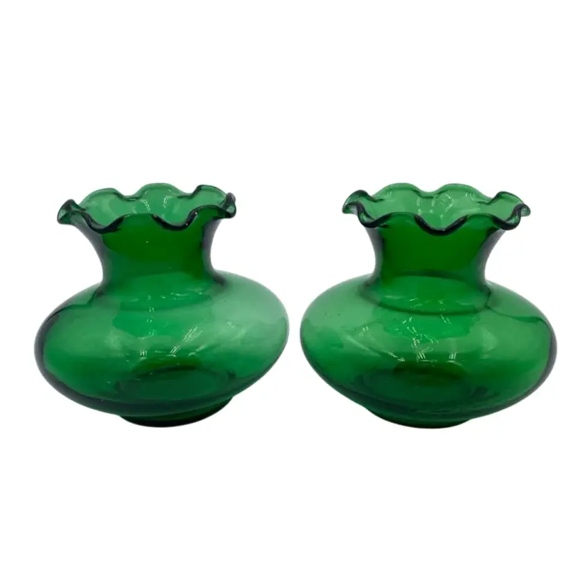 These vintage Anchor Hocking vases boast a stunning emerald green color and feature a unique ruffled rim. Measuring 3.5 inches in height and 4 inches in width, they are a perfect addition to any mid-century modern decor. The vase is made of high-quality glass and has a glossy finish, adding to its decorative appeal.
