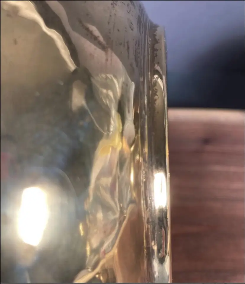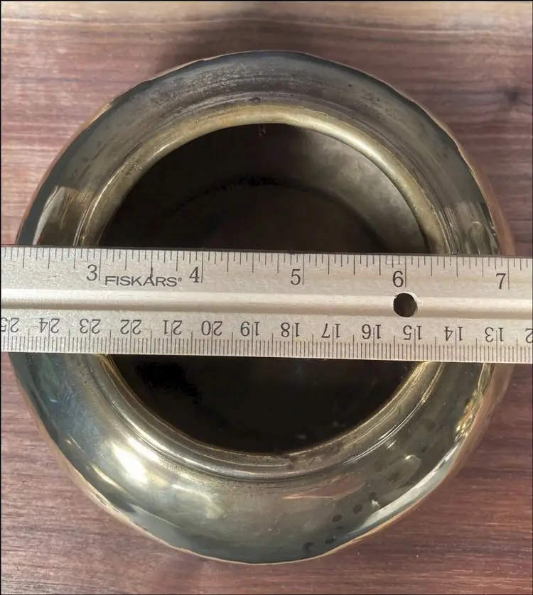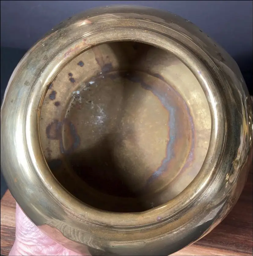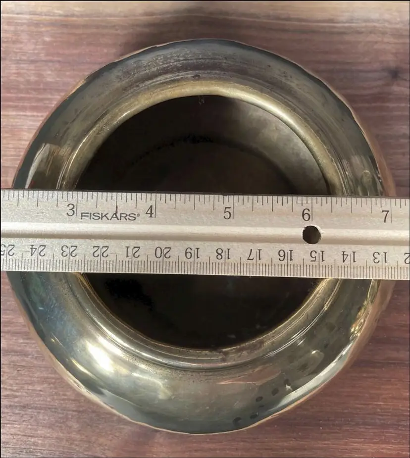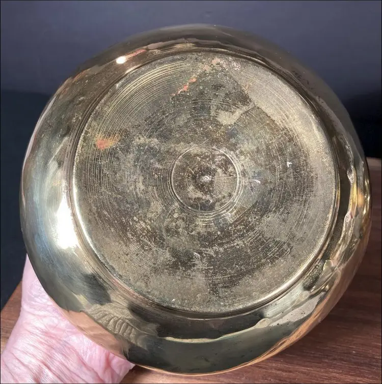 Aged patina surface, and you can see and feel the individual hammer marks in the metal..