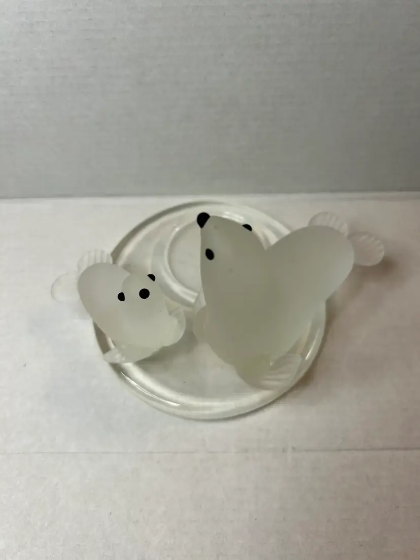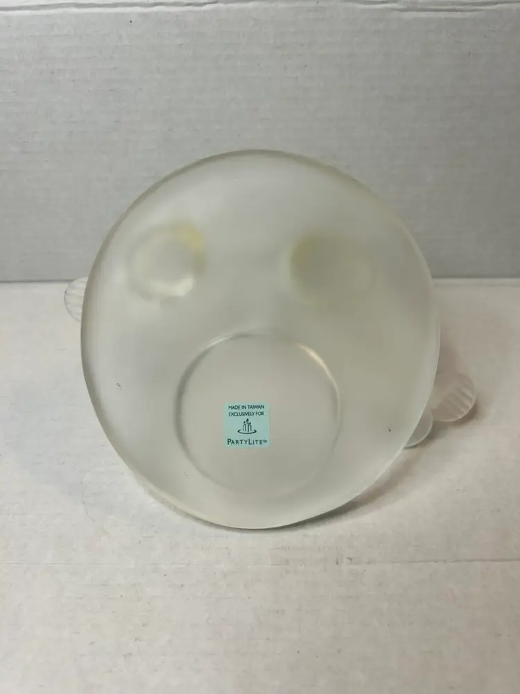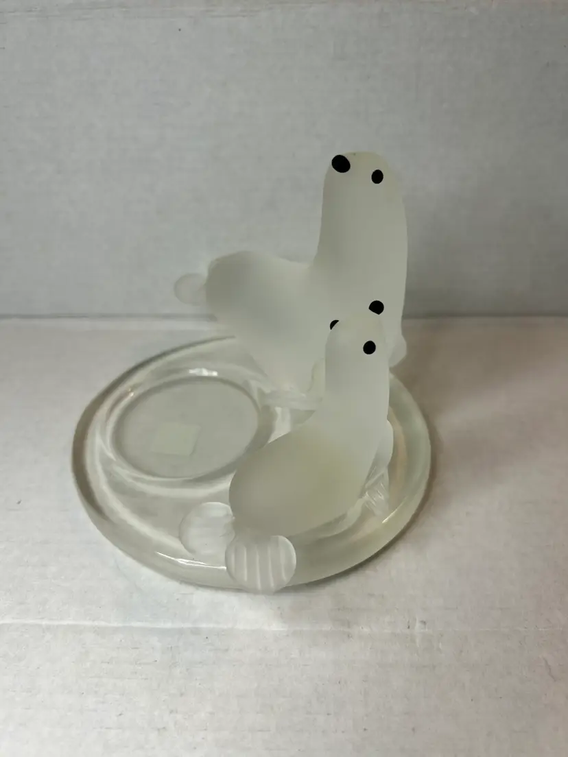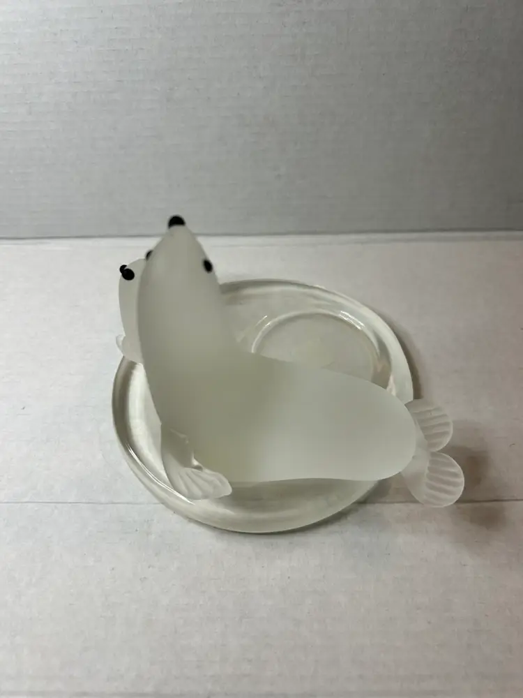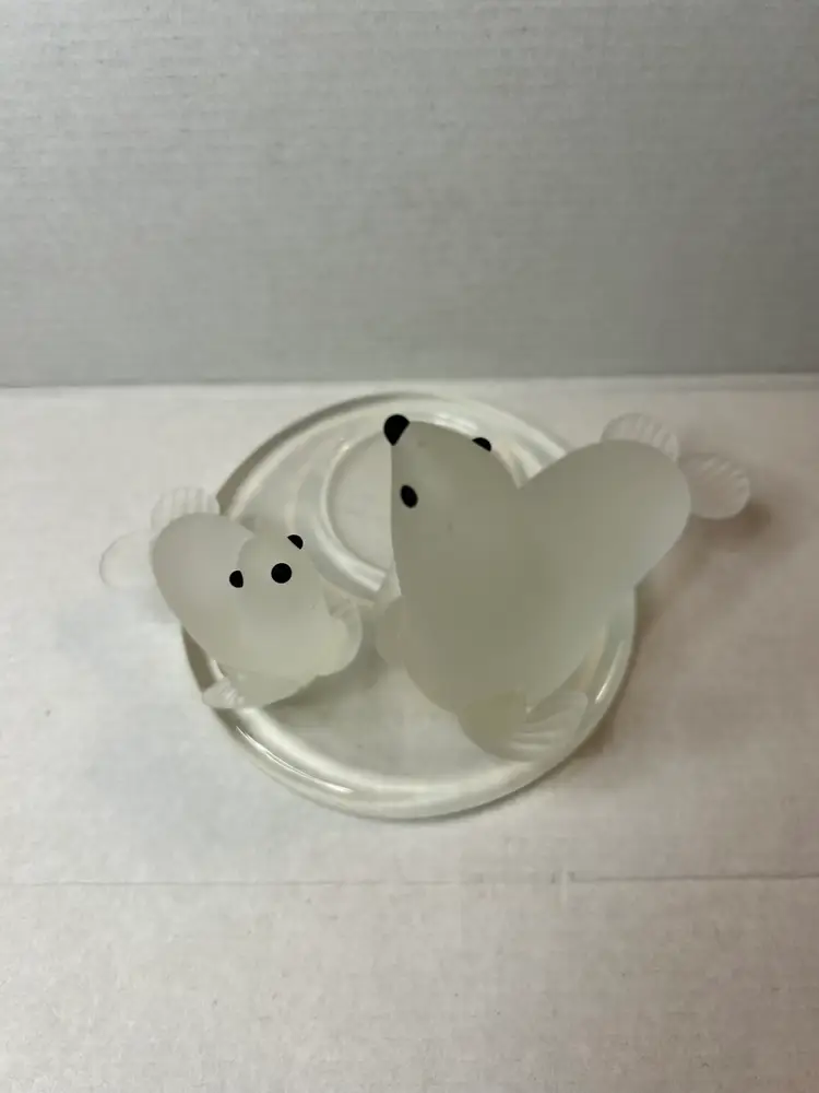 This PartyLite candle holder depicts a beautiful arctic scene with a mother seal and her pup. Made of frosted glass it is suitable for holding votive candles or tealights. This original piece was manufactured in 2005.