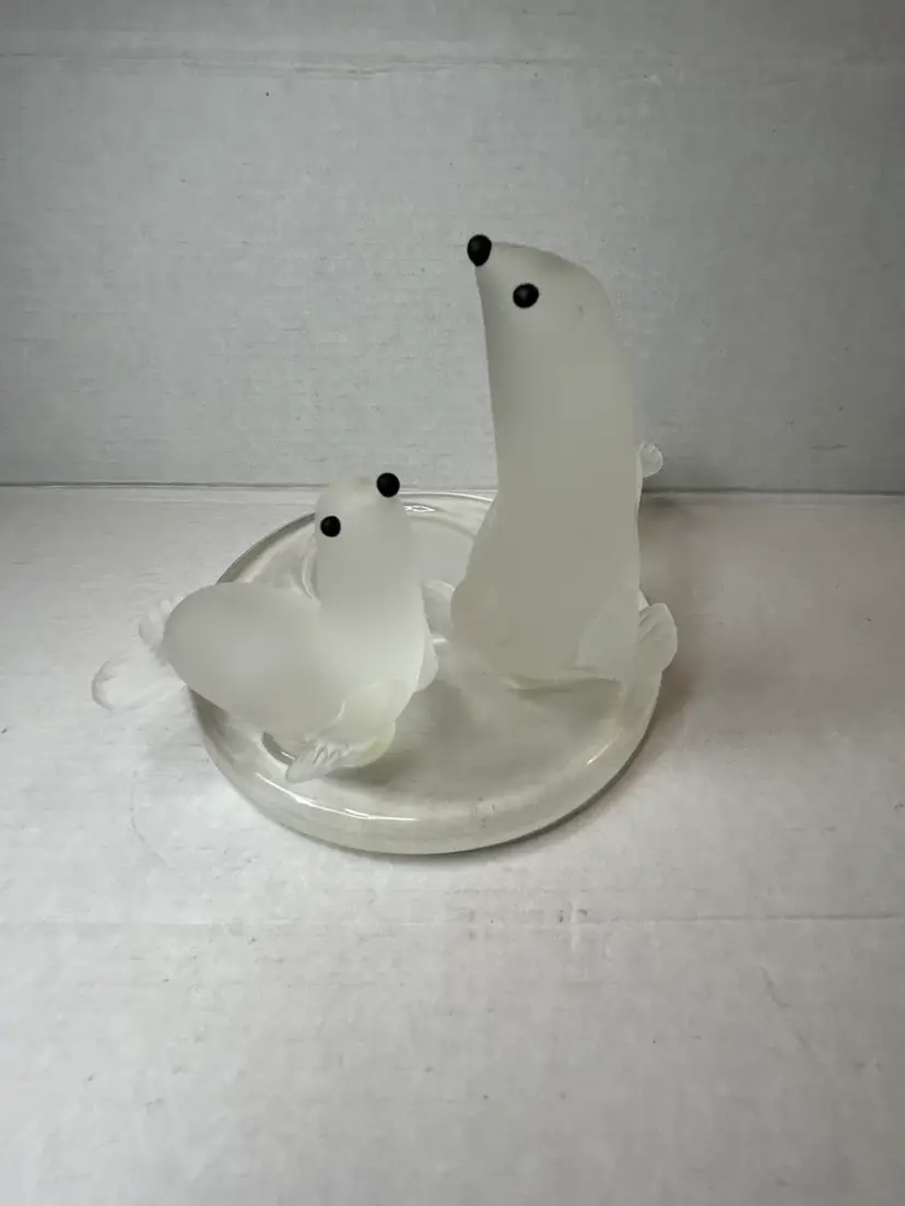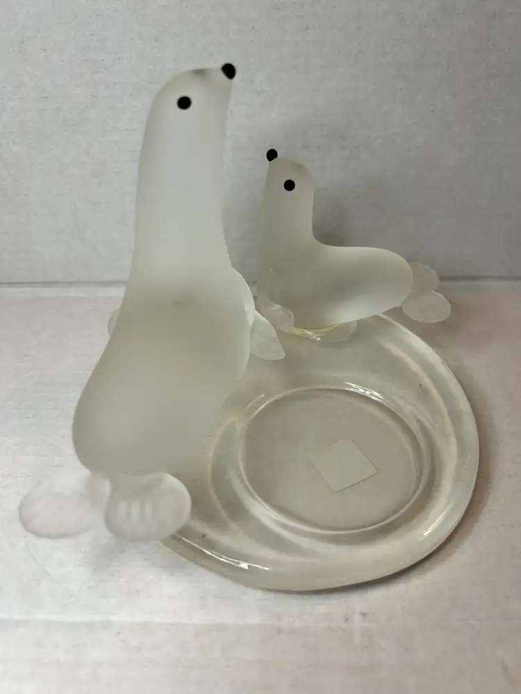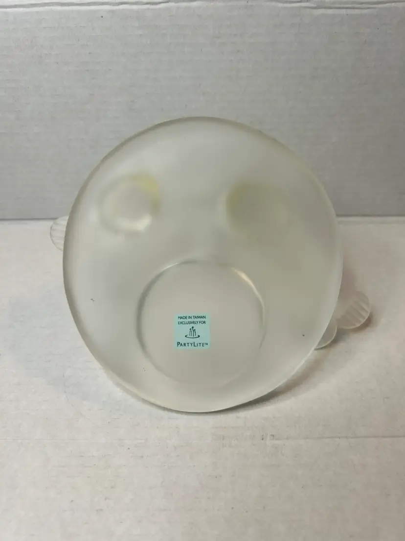 This PartyLite candle holder depicts a beautiful arctic scene with a mother seal and her pup. Made of frosted glass it is suitable for holding votive candles or tealights. This original piece was manufactured in 2005.