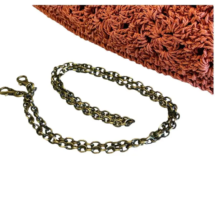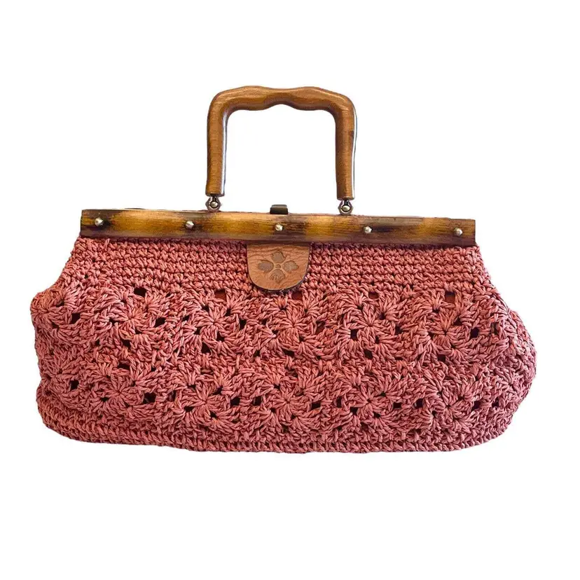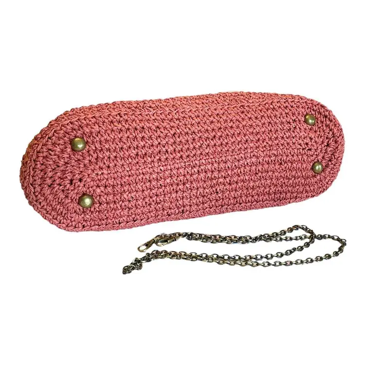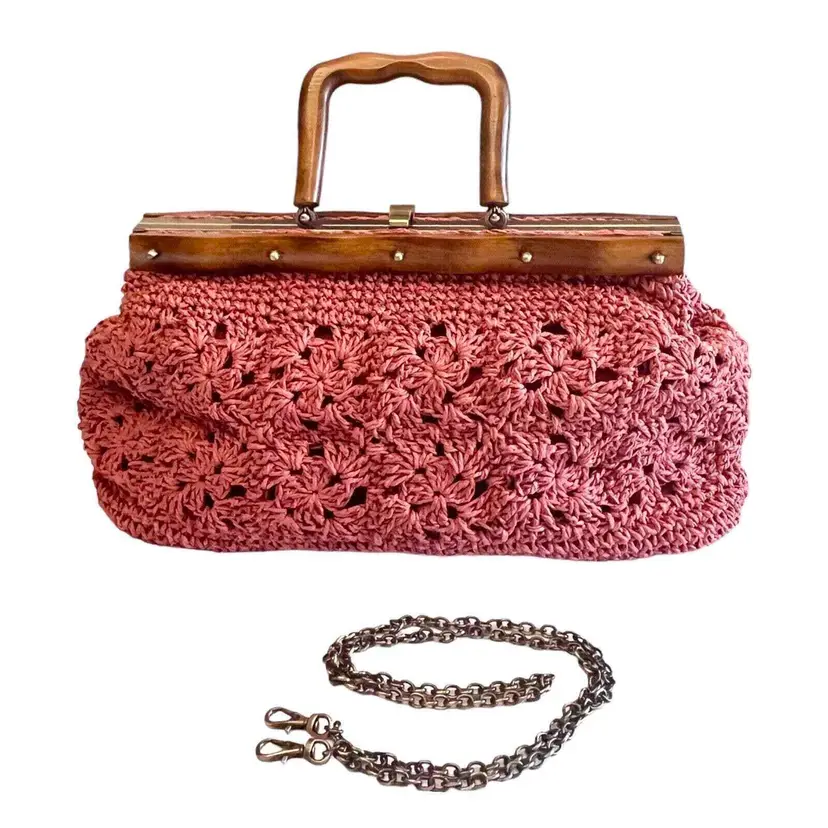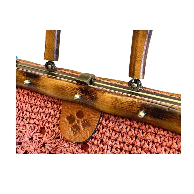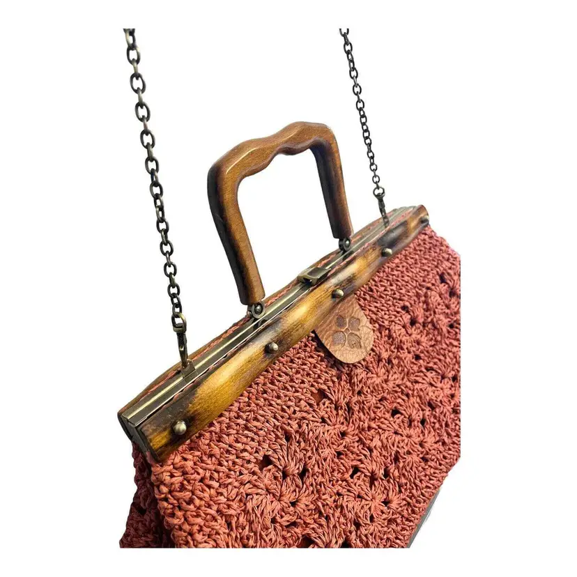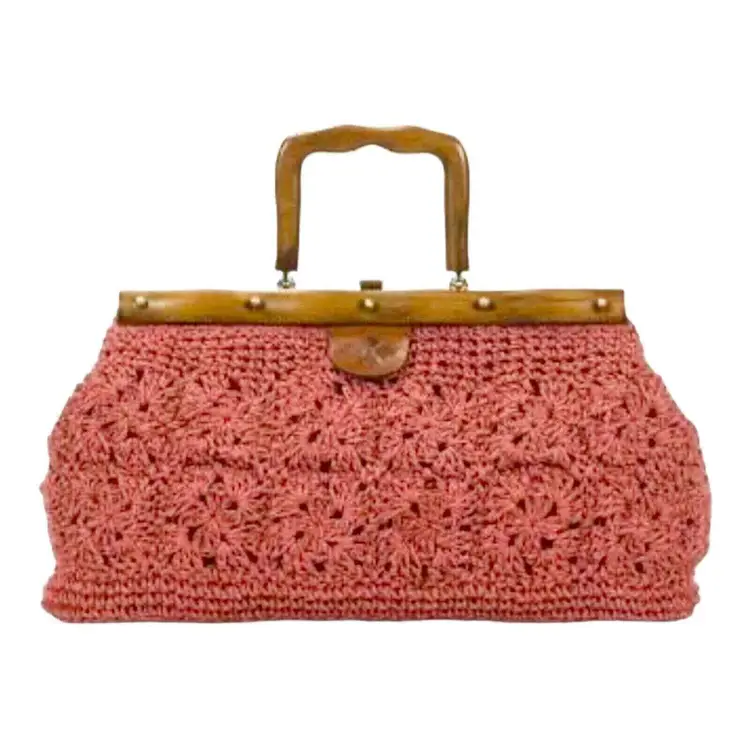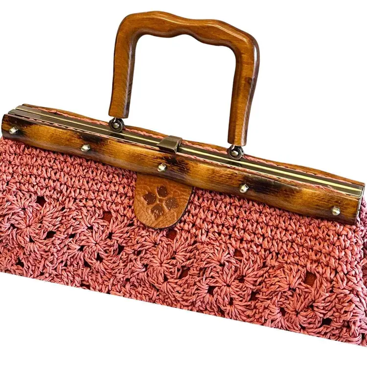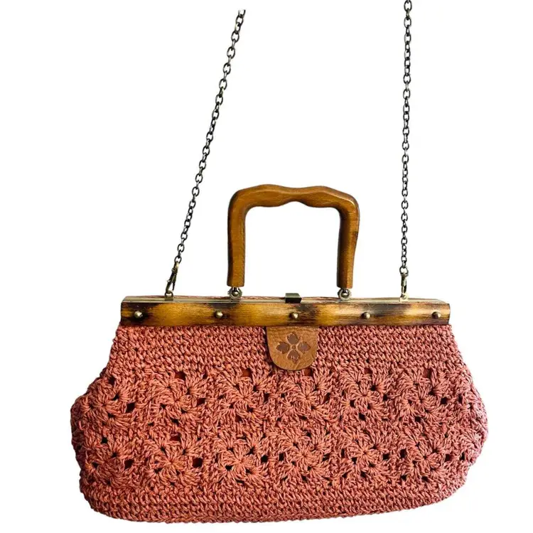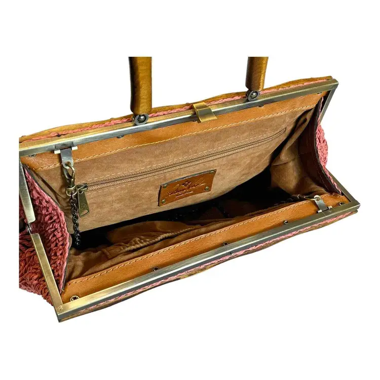 Brand: Patricia Nash Color: Orange Closure: Latch, Flap & Buckle Vintage: Yes Lining Color: Brown Shape: Horseshoe Bag Height: 8.25 in Hardware Color: Brass Lining Material: Faux Suede Size: Medium Product Line: Patricia Nash Exterior Color: Salmon Pink Model: Carmen Frame Bag Theme: Raffia Frame Handbag Occasion: Business, Casual, Party/Cocktail, Travel, Wedding, Workwear Accessories: Detachable Strap Bag Depth: 5 in Pattern: Floral Crochet Handle Drop: 4 in Department: Women Style: Satchel Features: Convertible, Cross-Body Strap, Inner Pockets, Lined, Removable Chain Strap, Hidden Shoulder Strap Strap Drop: 19 in Hardware Material: Brass Handle/Strap Material: Wood & Metal Bag Width: 15.5 in Exterior Material: Leather, Metal, Raffia, Straw, Wood, Crochet Finish: Crochet Accents: Latch, Metal Feet, Wood Frame Fabric Type: Raffia Handle Style: Satchel + Removable Metal Chain Strap Handle/Strap Color: Brown & Antique Bronze