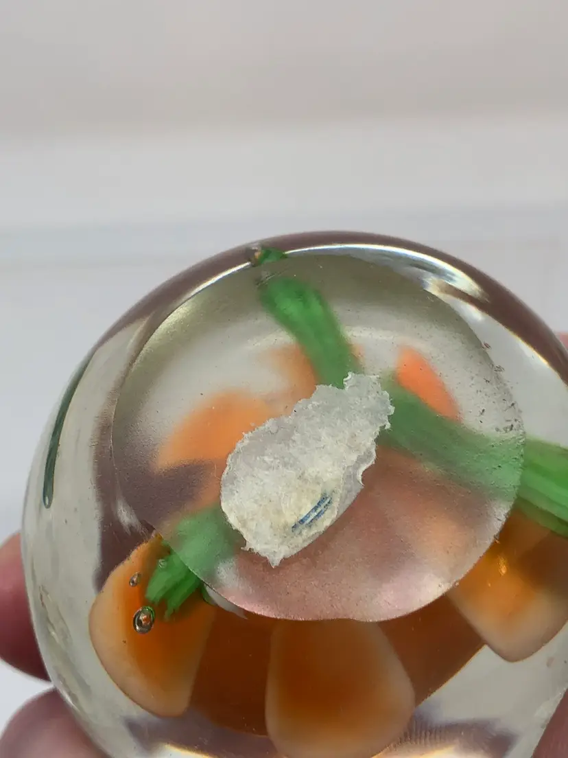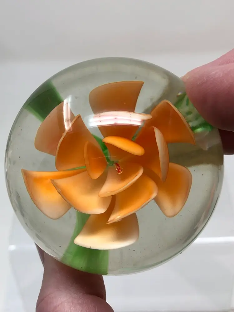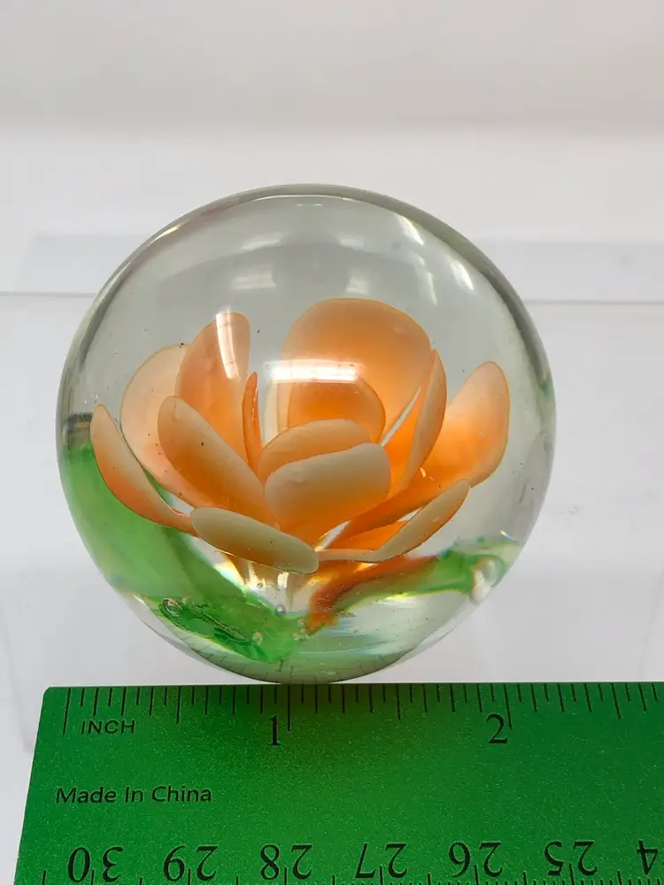 2" blown glass paperweight with peach petal flower. No markings, partial label on the base