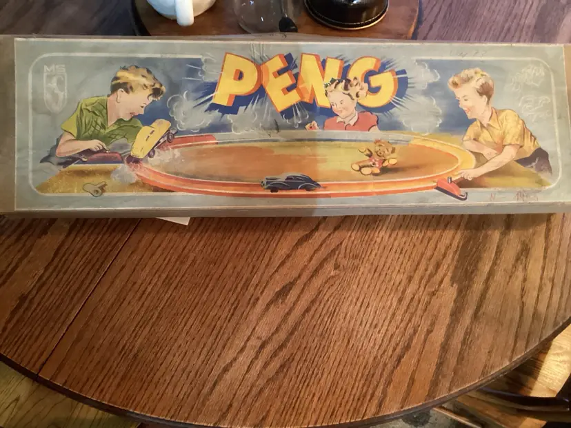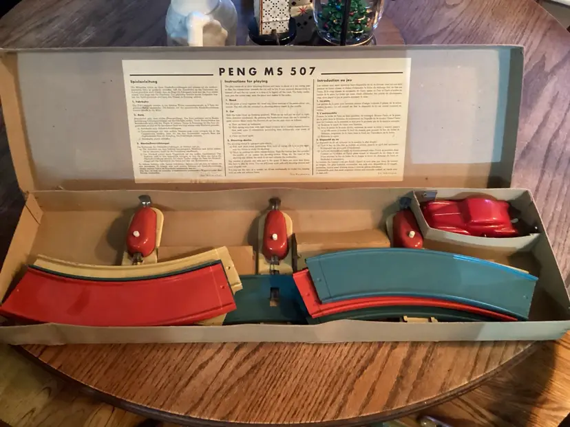 West German post war wind up toy. All there and all works. Wind up car and let it race around the track. Body of car sets like a mouse trap. As the car races around use one of 3 stations to trip lever on car and flip car body up. Very rare toy.