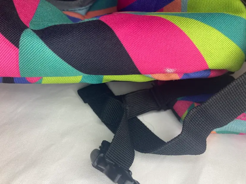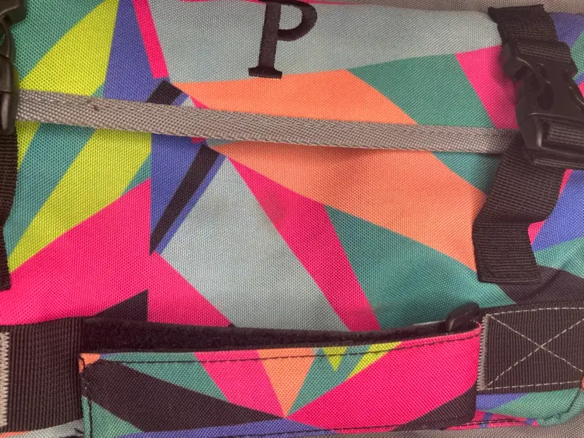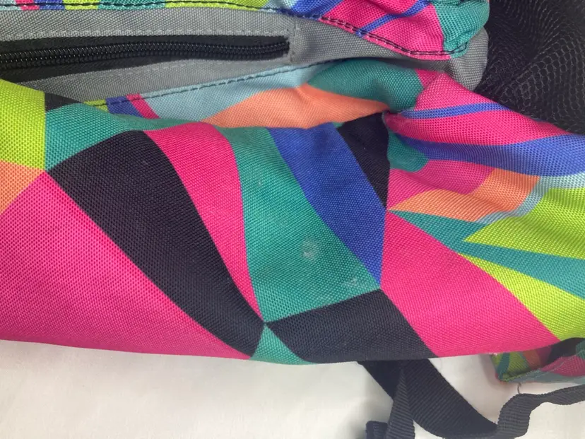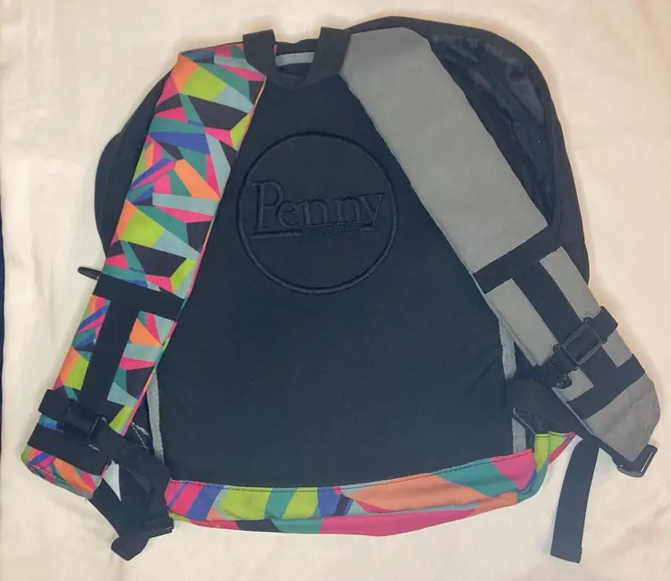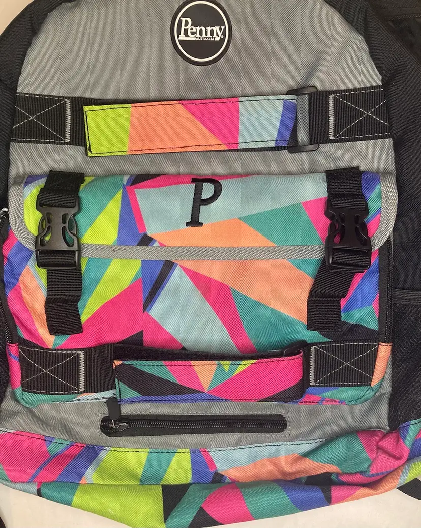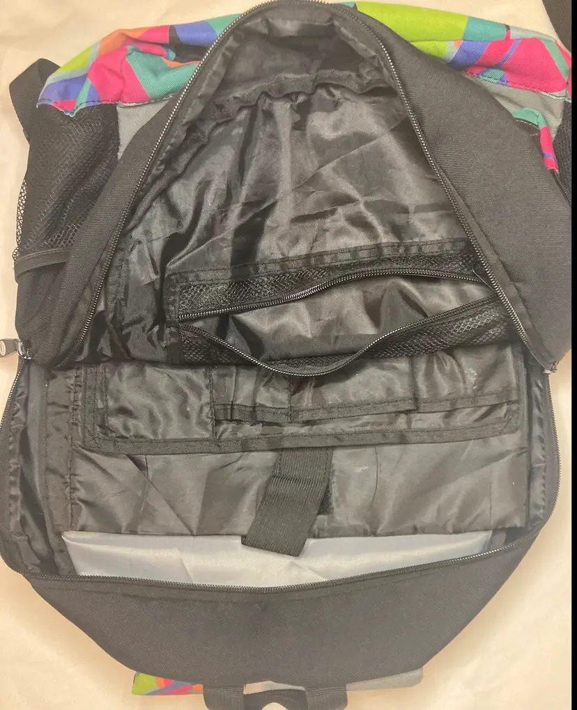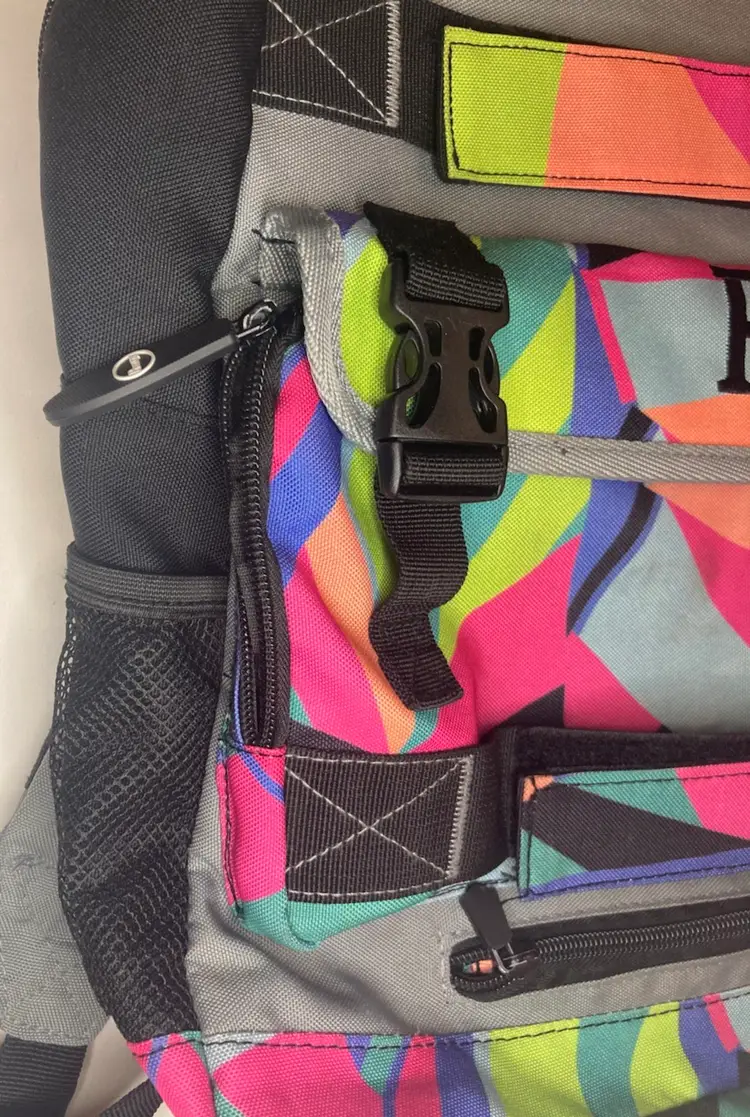Good Pre-Owned Condition One spec lower front left (see photo) Minimal wear to bottom (see photo) 2 Velcro skateboard straps 1 zippered full-size drop-in compartment with -2 mesh slip-in compartments -1 half-size slip-in compartment -3 small slip-in compartments -3 pencil/pen compartments 1 front half-size drop-in, zippered compartment with -1 medium slip-in compartments -1 small slip-in compartment -1 mess slip-in compartment 1 lower front up-fold compartment, zippered 1 rear tongue zippered compartment, dual padded -1 half-size slip-in compartment