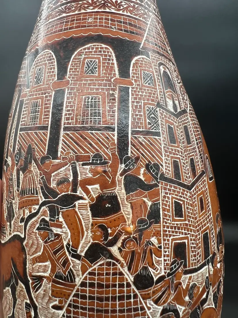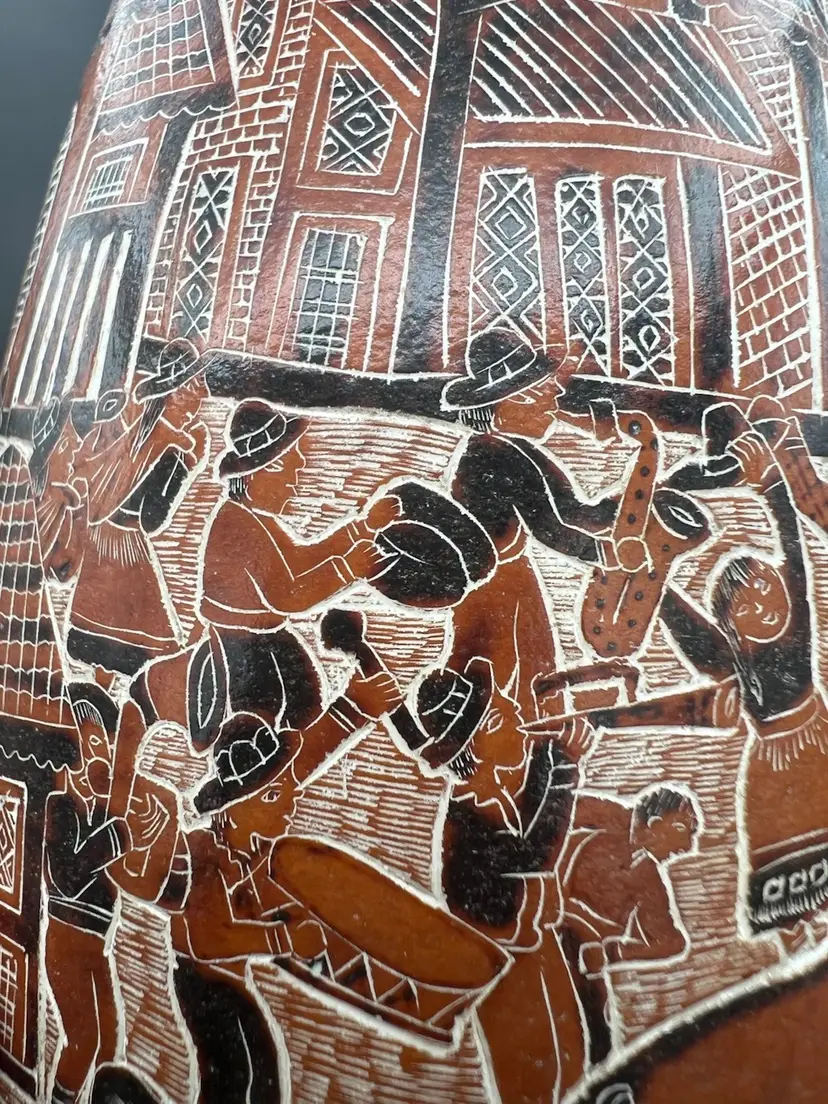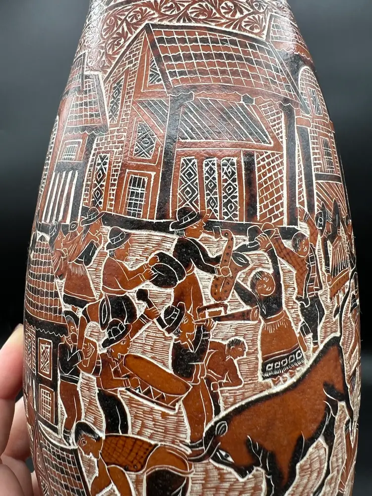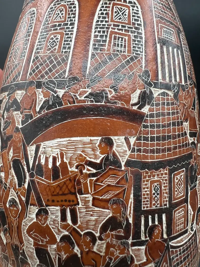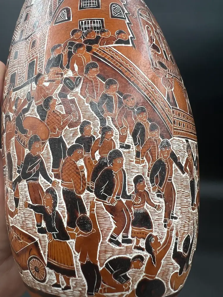 Made by a group of indigenous women in Peru. Very intricate design depicting different festivities. A true work of art. Very good condition.