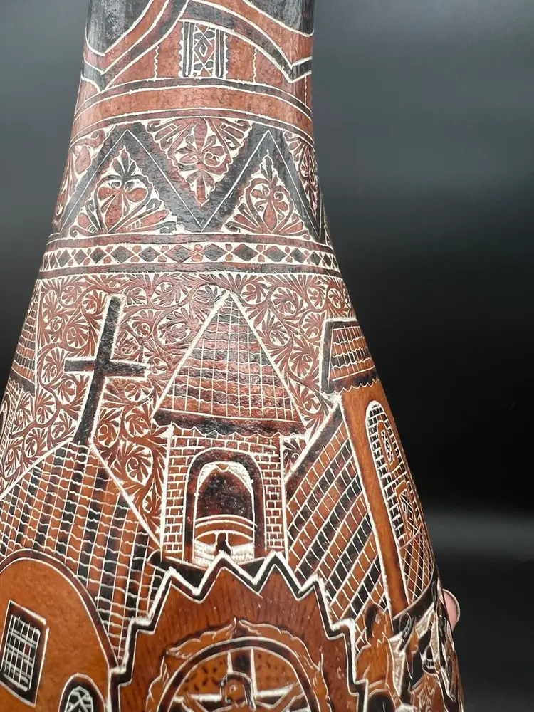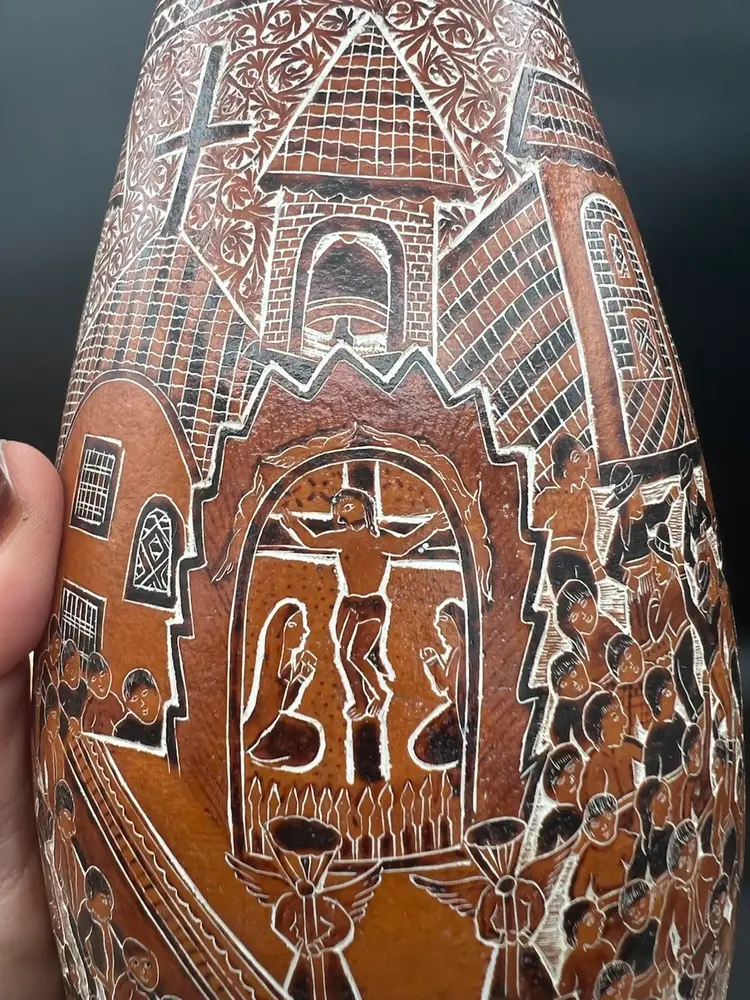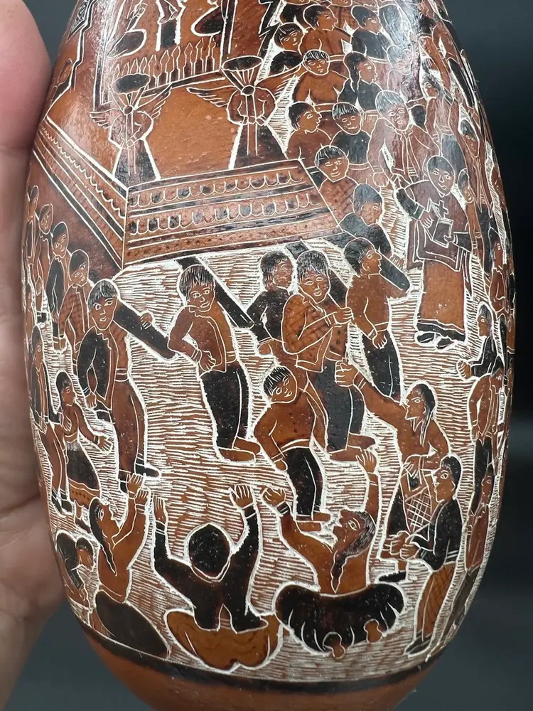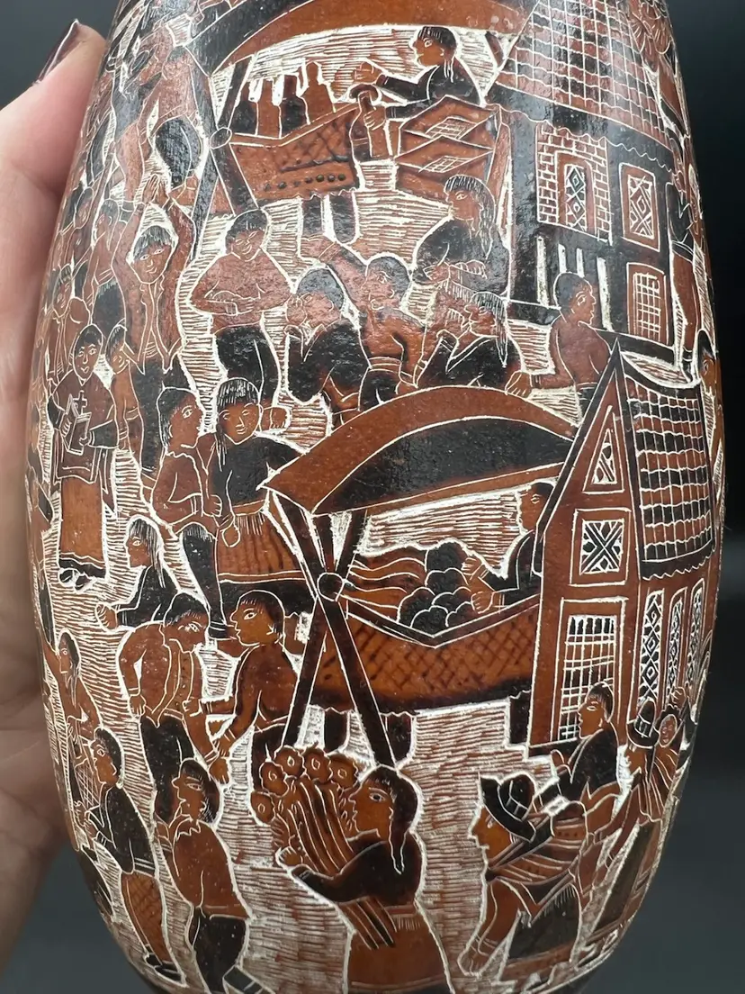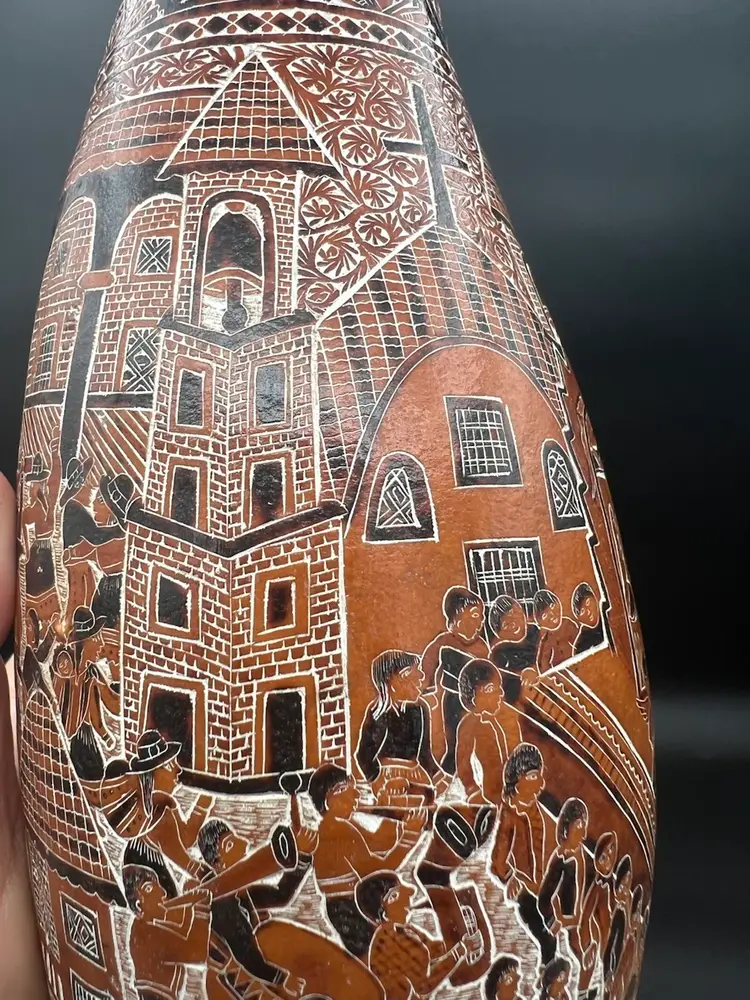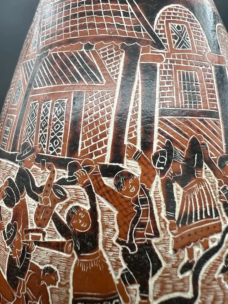 Made by a group of indigenous women in Peru. Very intricate design depicting different festivities. A true work of art. Very good condition.