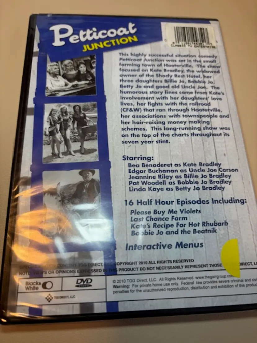 Take a trip to the little ol' place called the Shady Rest at the Junction. 16 episodes of the classic series Petticoat Junction. New in shrink DVD. This show took place in the same continuity as Green Acres, and the two shows had a character or two shared.