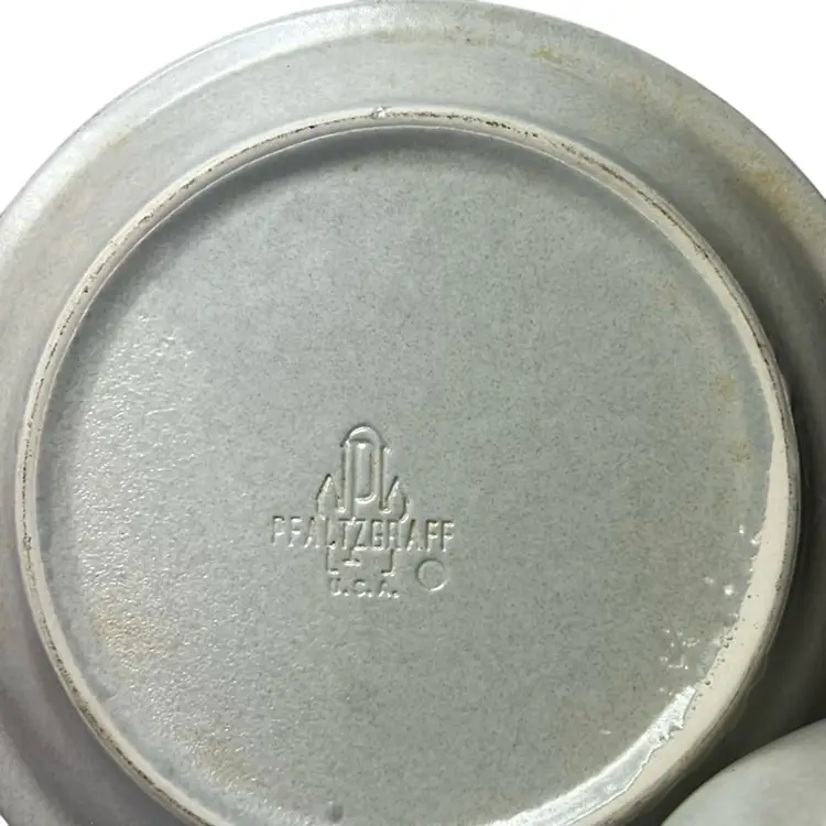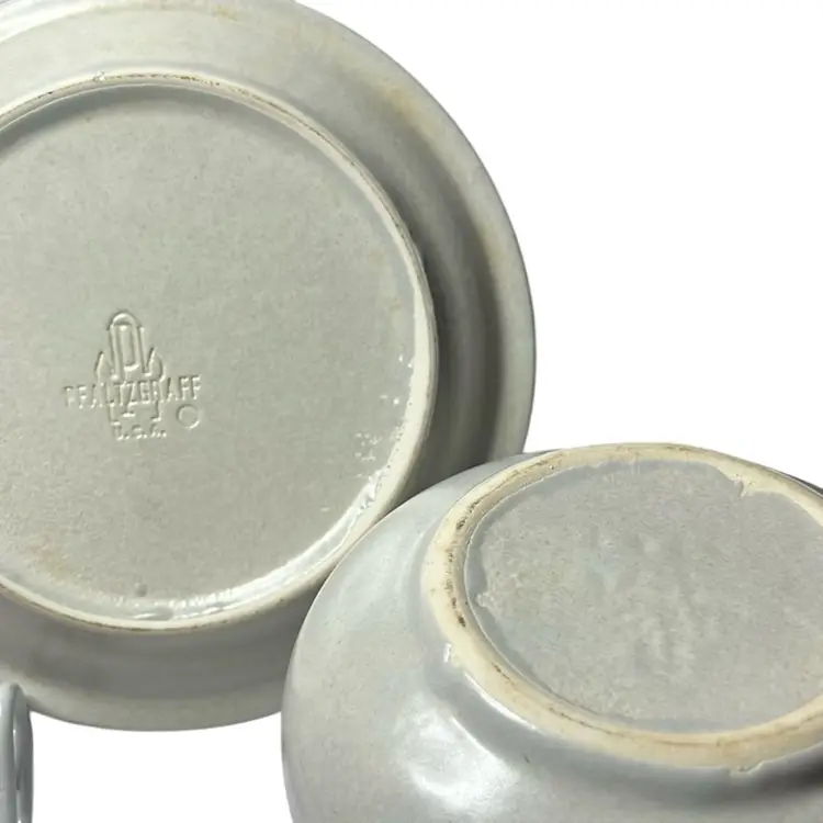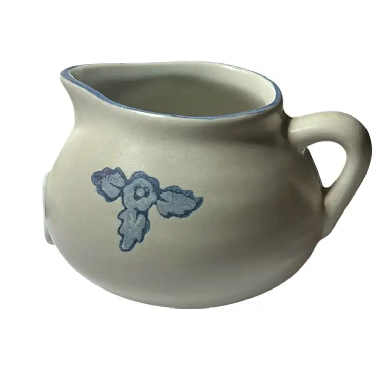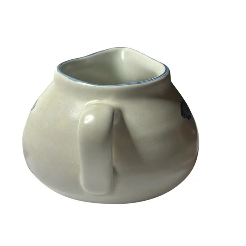 Blue floral design on stoneware, introduced in 1967. Holds 22 oz and is microwave & dishwasher safe. No damage. Measures 8” long & 4 1/4” tall