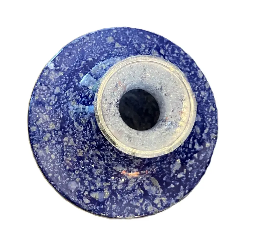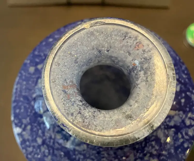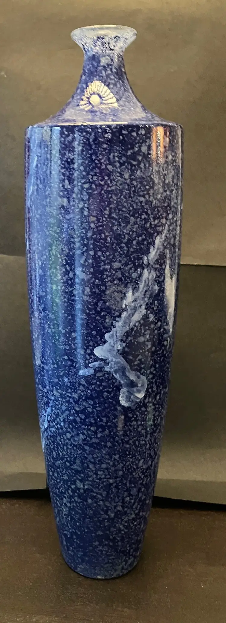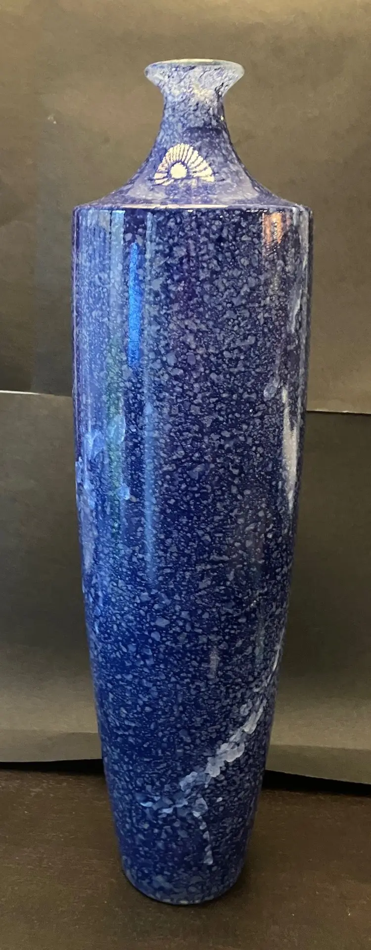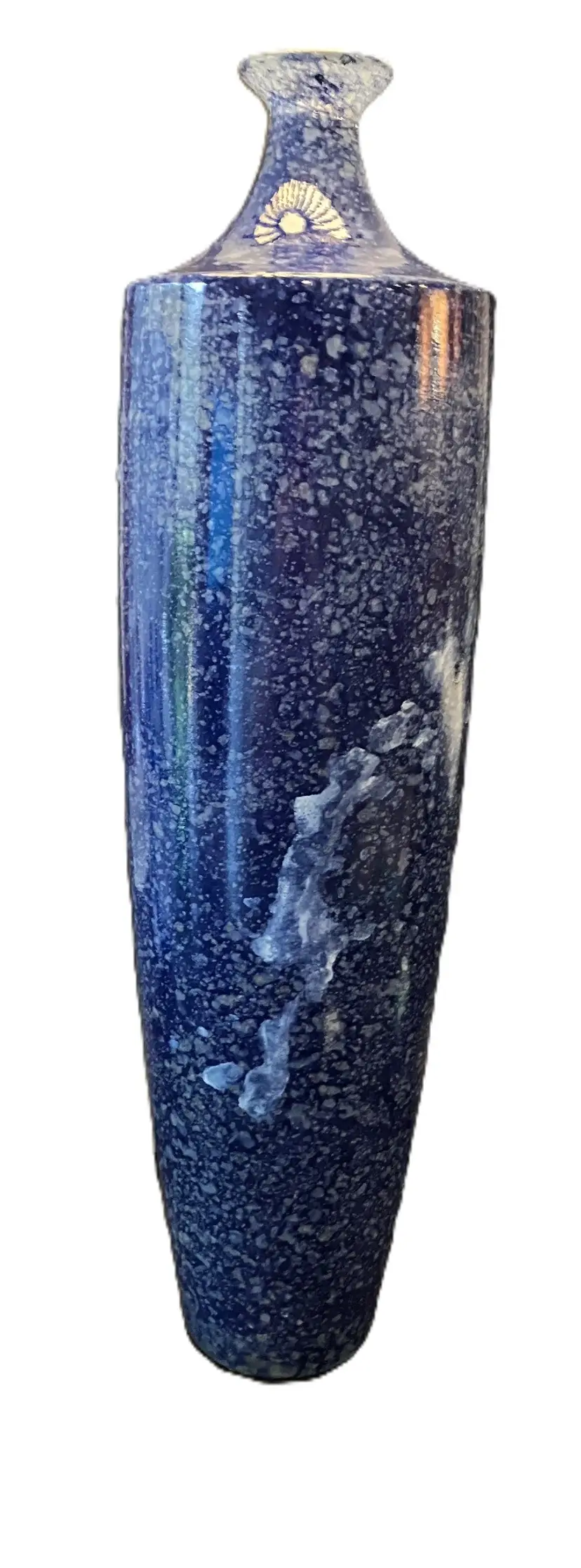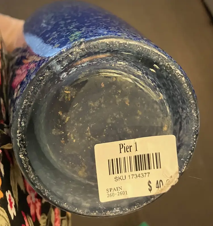Cobalt Blue with White Markings. The only defect is a small chip on the rim as seen in the images. Measurements: 18" tall and 3" diameter at the base, 5" at its widest, 1 3/4" wide at the opening. Weighs 4 lbs before packaging. Sticker on the bottom identifies this from Pier 1 and was made in Spain.
