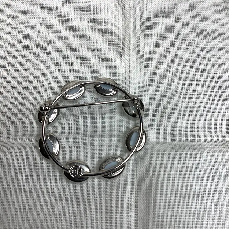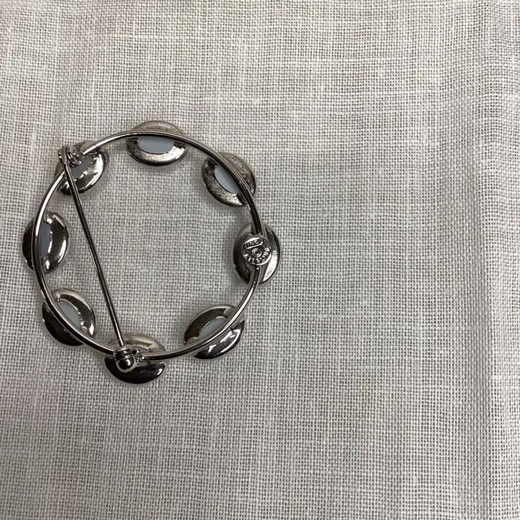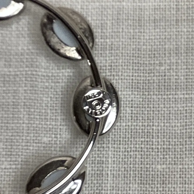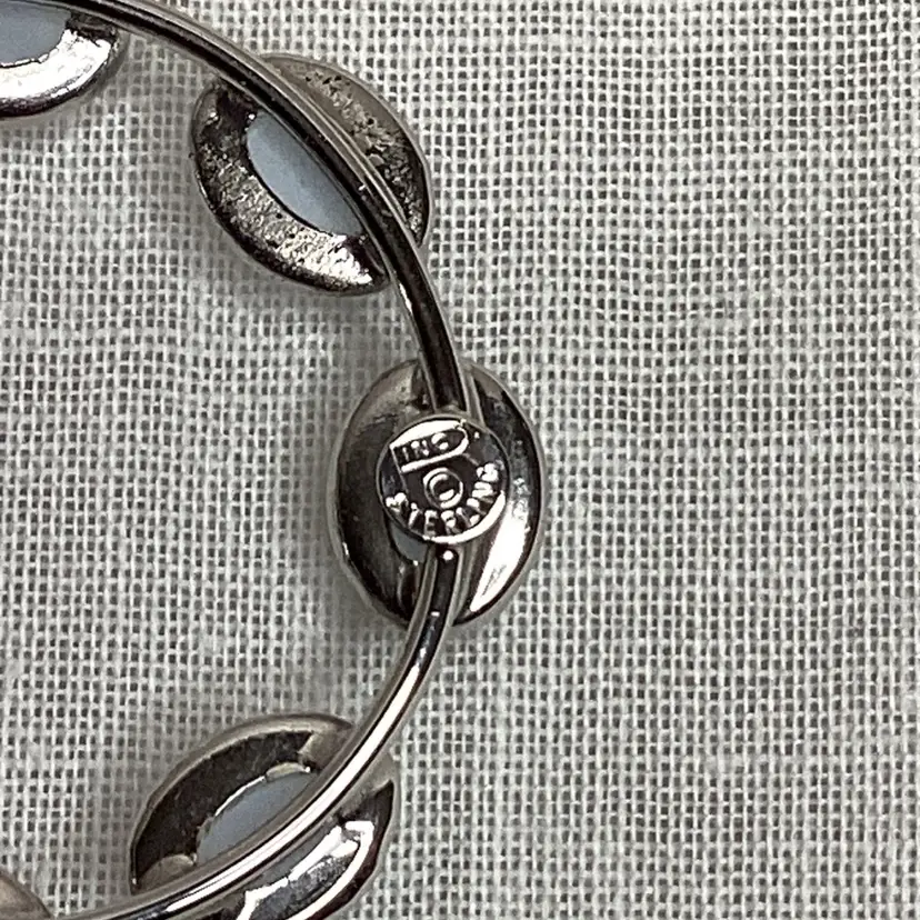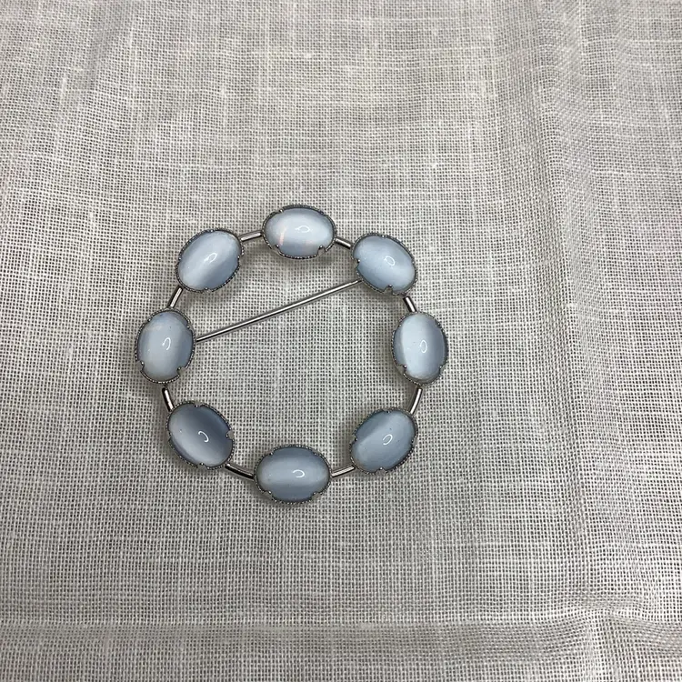 This brooch is in excellent condition with little signs of wear. It has blue stones that look like moonstone set in sterling silver. It is marked on the back Sterling with an R.