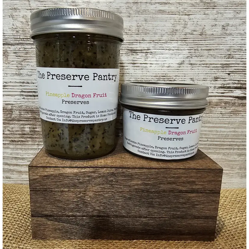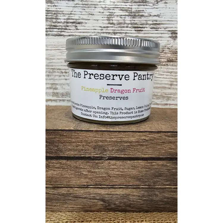 Take your tastebuds on a tropical vacation with our Pineapple Dragon Fruit Preserves! Made with juicy, sweet pineapple and vibrant dragon fruit Naturally sweetened with just the right amount of sugar Bright, tropical flavor with hints of citrus Every spoonful delivers a burst of sunshine, with the sweetness of pineapple and slight tartness of dragon fruit melding into a symphony of tropical flavor. Spread it generously on your morning toast or English muffin for a quick island getaway before you start your day. Or, try it as a topping on yogurt, ice cream, or pancakes. However you use it, this preserve will add an exotic twist to your breakfast or snack. For those craving an escape from the ordinary, our Pineapple Dragon Fruit Preserves provides a taste of the tropics in a jar. Treat yourself to its bright, fruity flavor today! Ingredients: Pineapple, Dragon Fruit, Sugar, Lemon Juice, Pectin.