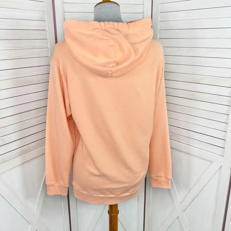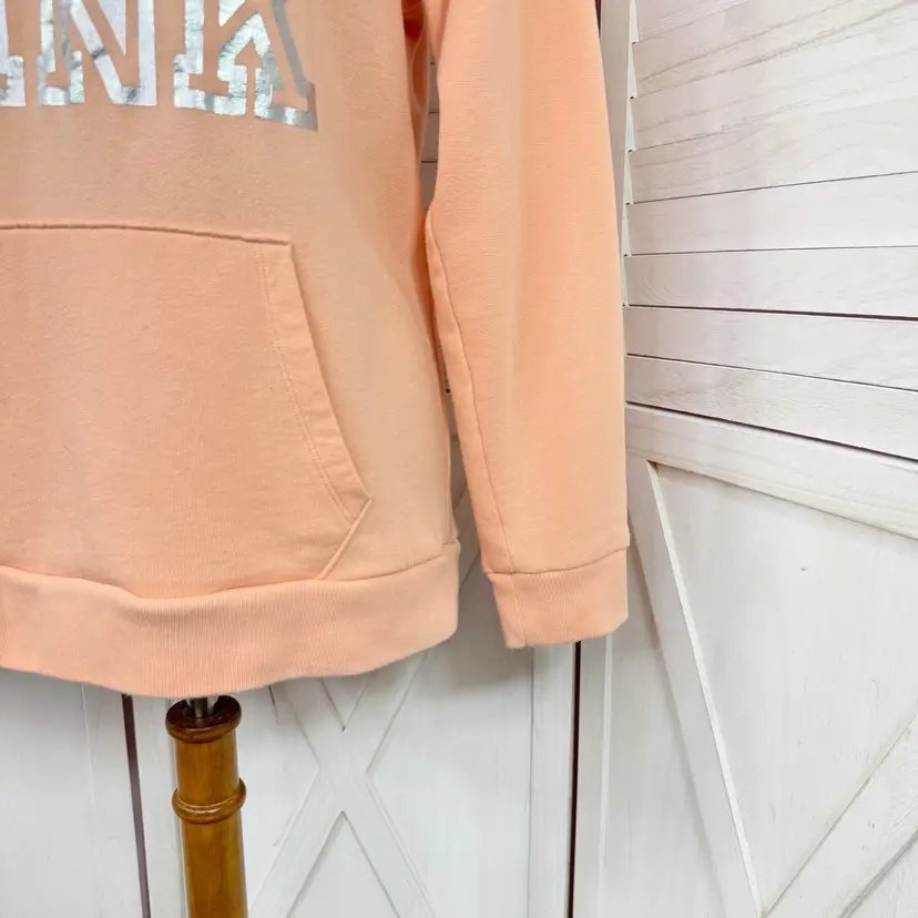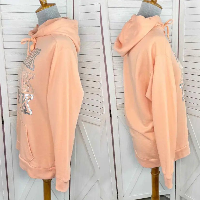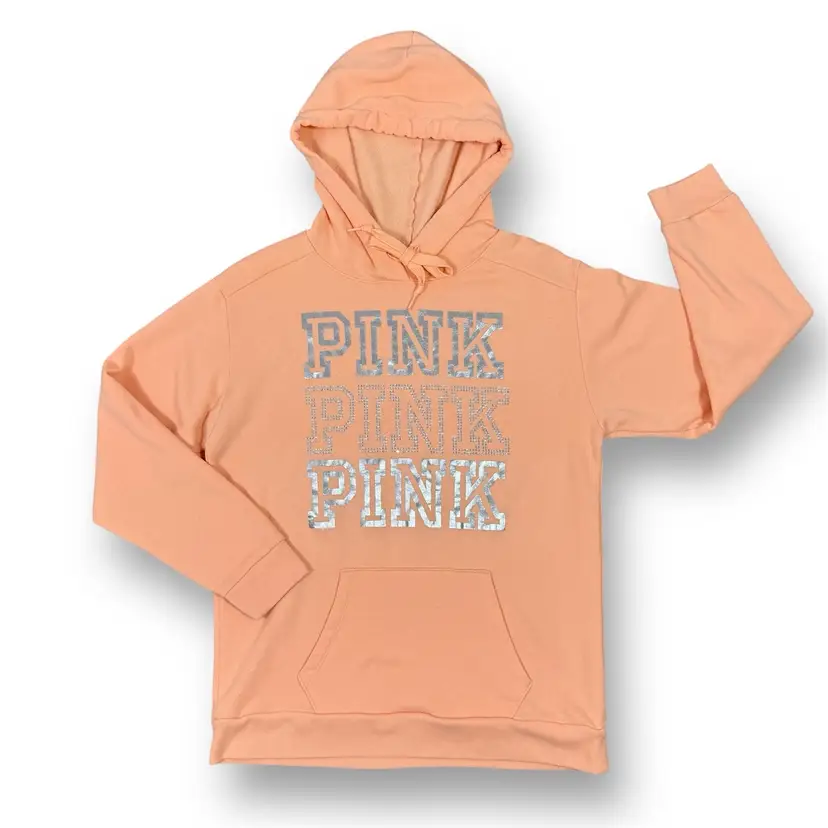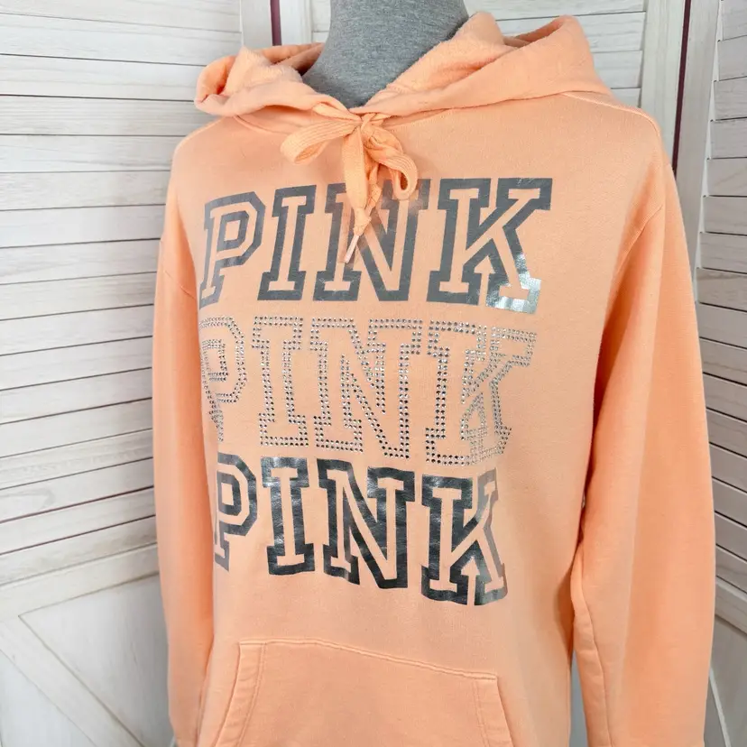 Sherbet orange color Metallic foil silver & rhinestone triple logo front Front kangaroo pocket Drawstring hood Long sleeve Ribbed knit cuffs & hem